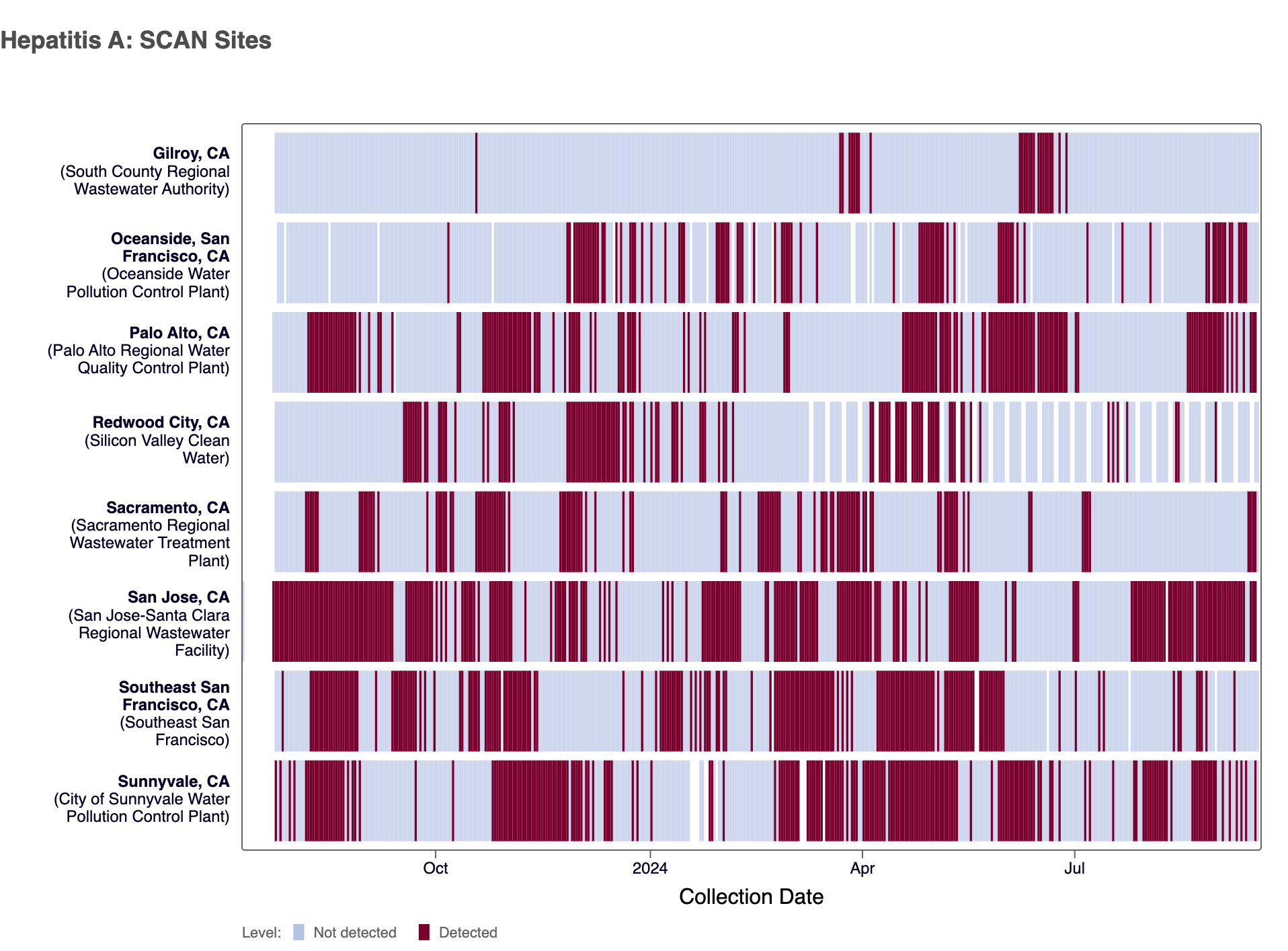 Hepatitis A RNA was detected at six of the SCAN sites in the last 3 weeks (Oceanside SF, Palo Alto, San Jose, Southeast SF, SVCW and Sunnyvale). Below are the current wastewater categories for the SCAN sites (the category is determined by the frequency of detection):