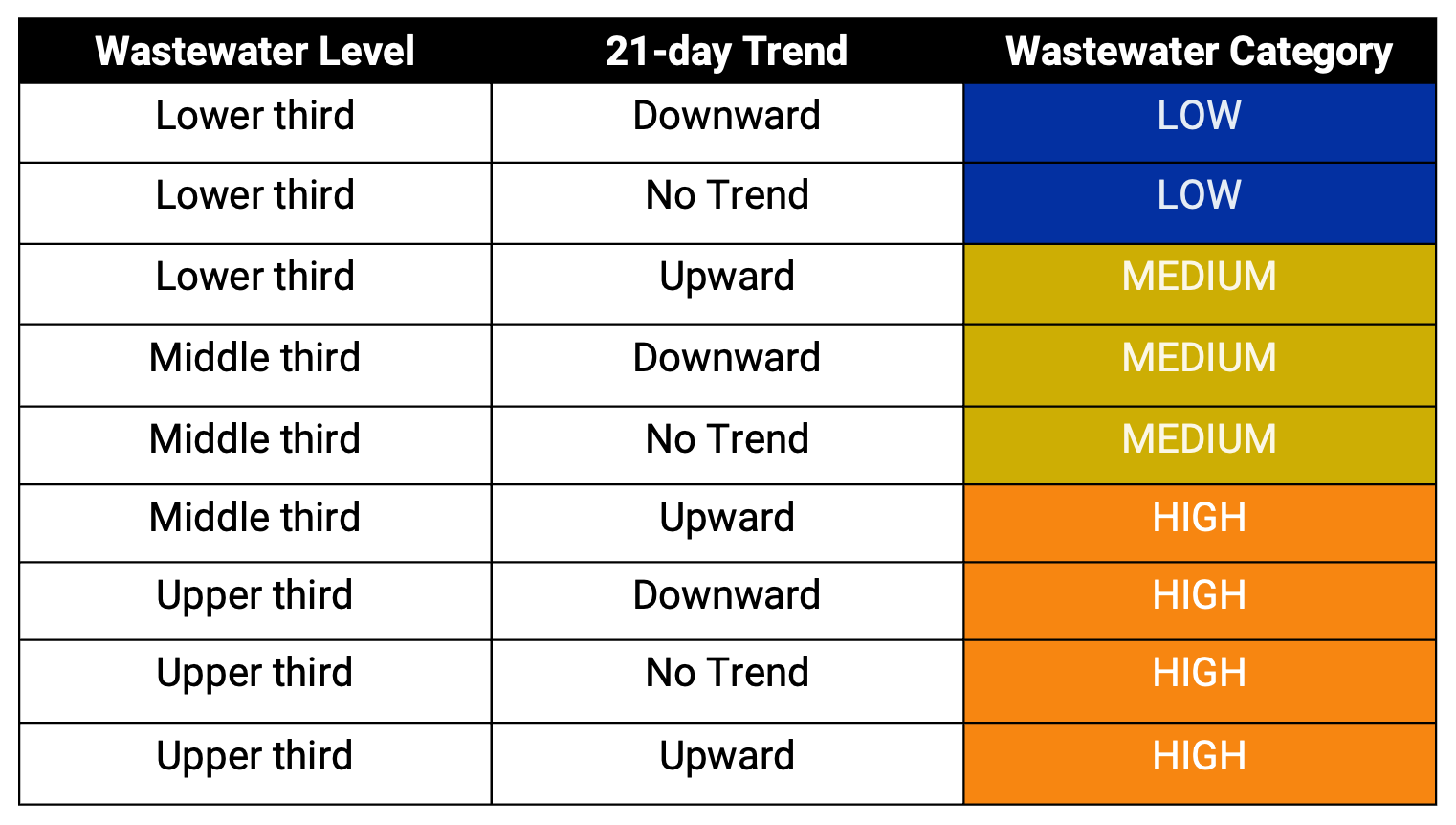 WastewaterSCAN uses a Wastewater Categorization system to communicate important insights from recent wastewater results. Research shows that the measurements we make in wastewater are related to disease in the community. The wastewater categorization helps us quickly understand if the recent measurements for a disease fall into a low, medium, or high category and are determined based on a combination of the following variables: