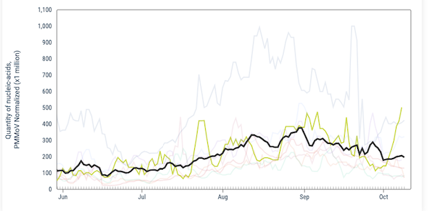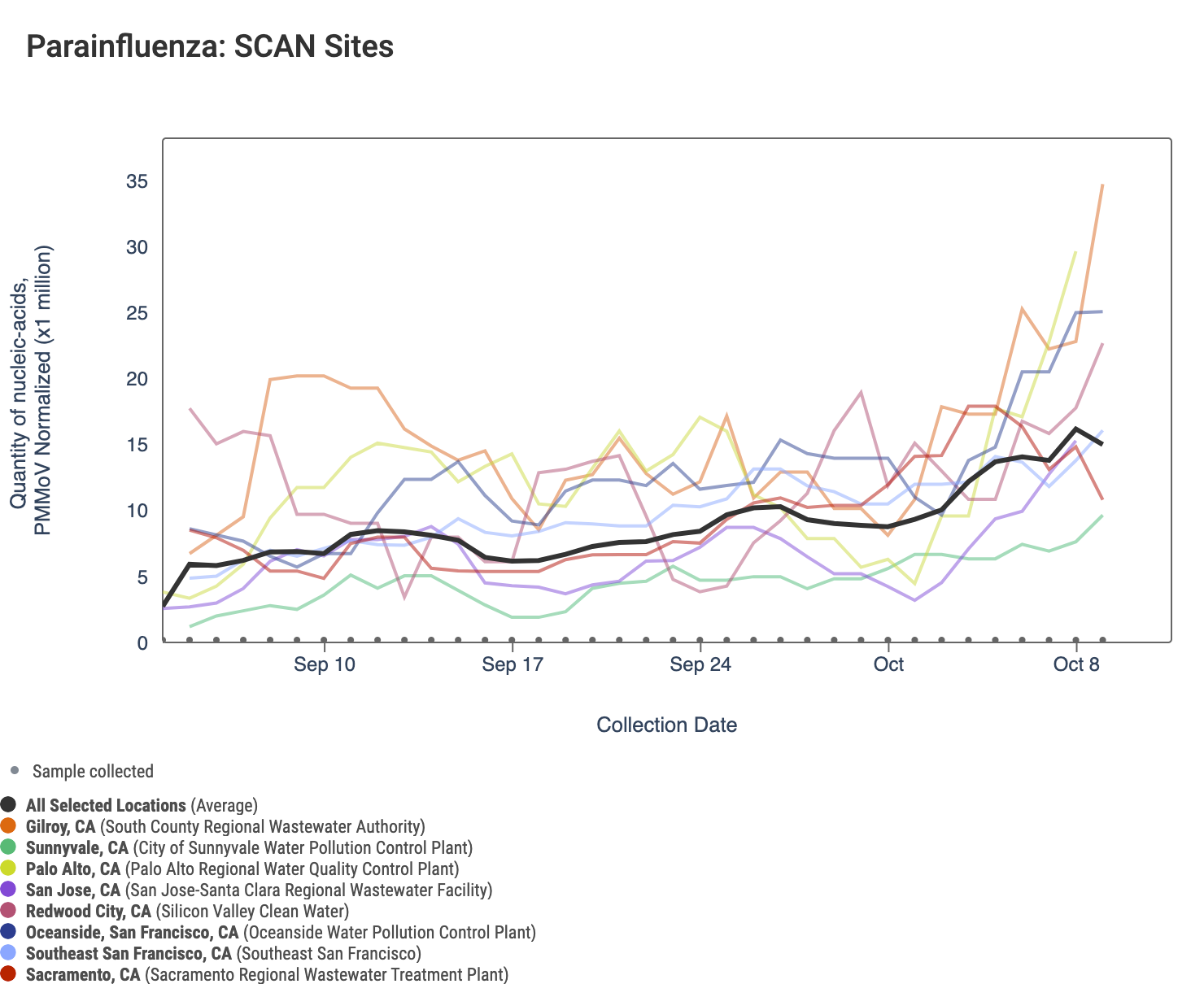 Parainfluenza RNA has been detected in most samples collected from SCAN sites. The population weighted average line is shown in black. You can access the chart here.