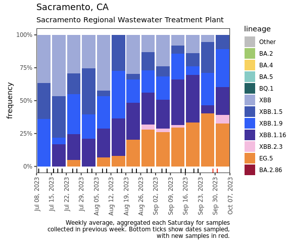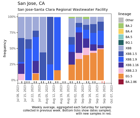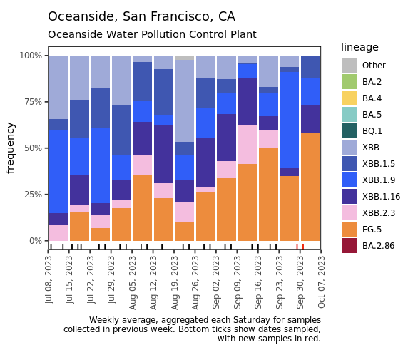 Below are plots from Oceanside, Sacramento, and San Jose showing the relative proportions of different variants inferred from sequencing the entire genome of SARS-CoV-2. Samples with low coverage are not being displayed in the plots (this explains the empty column for San Jose). In the most recent samples, you can see that that Oceanside SF had over 50% while San Jose had ~50% of the sublineage EG.5 (in orange). In the most recent sample, Sacramento had >25% of the sublineage EG.5. Note that the sequencing data are always from samples taken between 1- 2 weeks ago. We have not detected BA.2.86 in any SCAN samples yet.