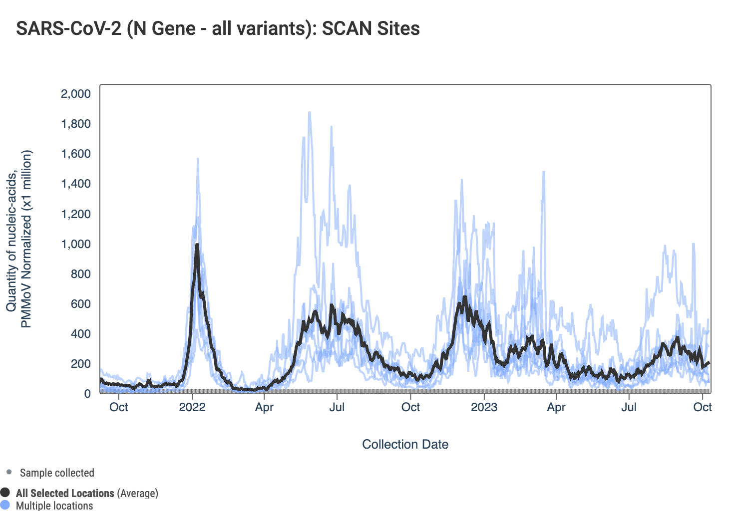 Below is a chart showing the National Levels benchmarks superimposed on the RSV data from the SCAN sites since the beginning of 2023 (you can access this chart here). Currently, Redwood City and Sacramento are in the middle third and all other SCAN sites have RSV concentrations in the upper third level.