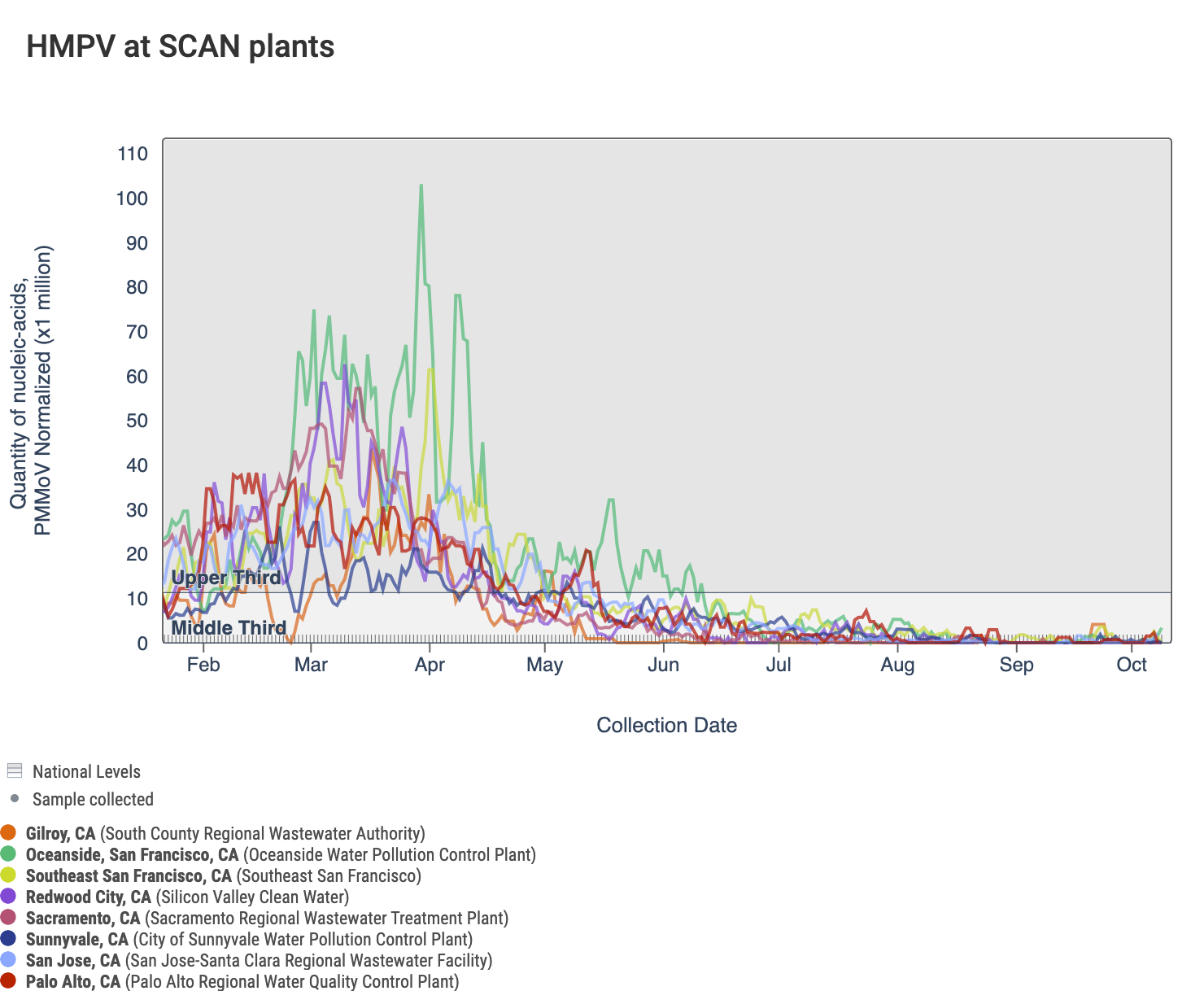 Below is a chart showing the National Levels benchmarks superimposed on the HMPV data from the SCAN sites since the beginning of 2023. (You can access the chart here.) Currently all SCAN sites have HMPV concentrations in the middle third level.