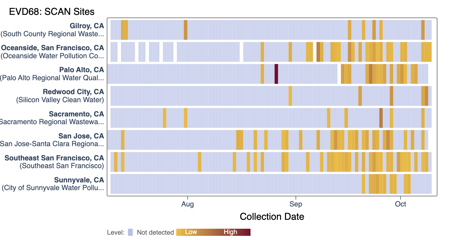 EV-D68 RNA was sporadically detected in samples collected in the last 21 days at most SCAN sites. The heat map below shows all the SCAN sites as a row, and each date as a column since monitoring began in July. Redwood City, Gilroy, and Sacramento have had few detects for EV-D68 RNA in the past 21 days. The color blue means the sample was non-detect for EV-D68 RNA and the colors get darker with higher concentrations. White indicates no sample was collected. You can access the chart here. EV-D68 is believed to occur biennially, and we saw it last year, as described in this preprint (which was just accepted to Emerging Infectious Disease).