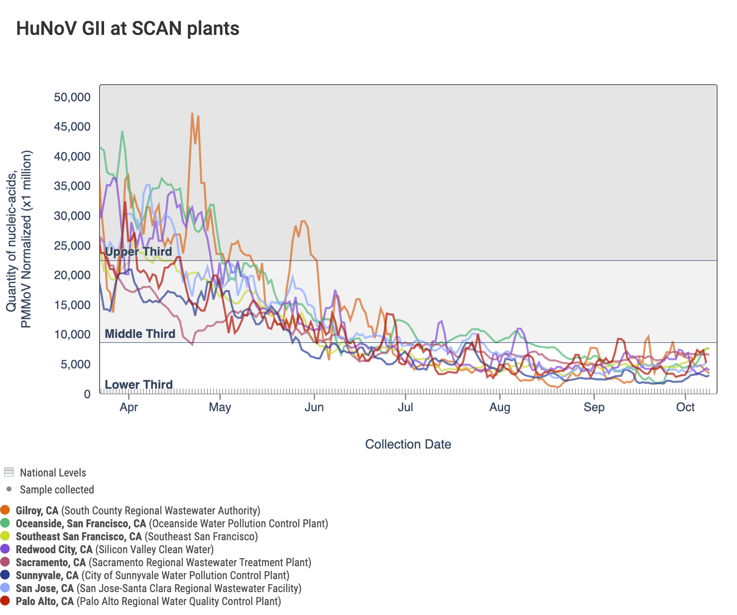 Below is a chart showing the National Levels benchmarks superimposed on the HuNoV GII data from the SCAN sites since the beginning of 2023. (You can access the chart here.) Currently all SCAN sites HuNoV GII concentrations in the lower third level.