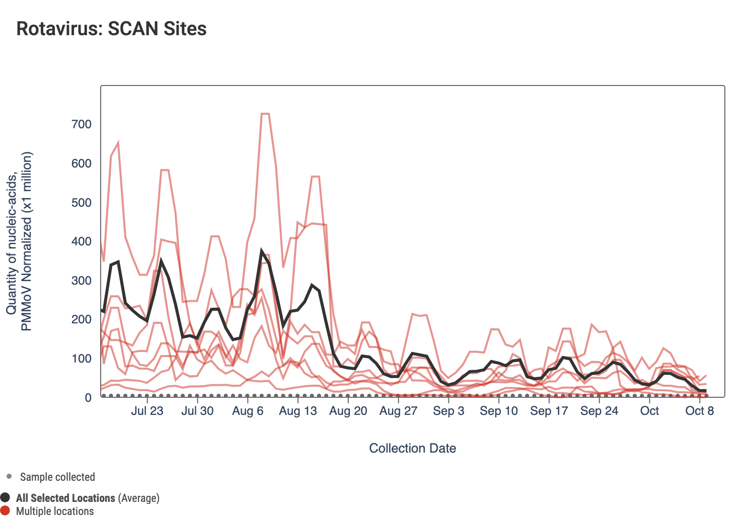 Rotavirus RNA concentrations are shown in the chart below; all the SCAN plants are shown together. The population weighted average line is shown in black. You can interact with the chart of all the plants at here.