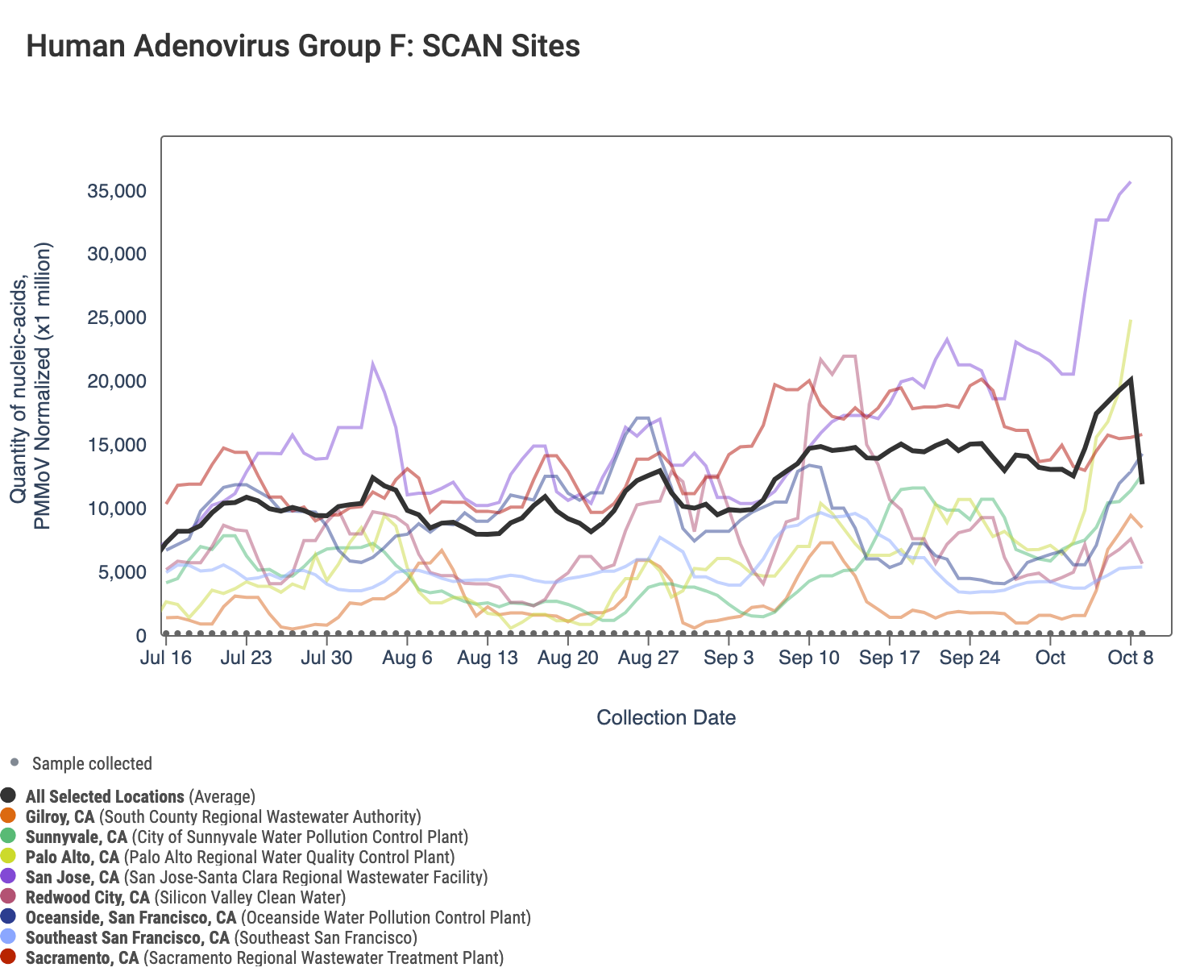 Human Adenovirus Group F DNA concentrations are shown in the chart below; all the SCAN plants are shown together. The population weighted average line is shown in black. You can interact with the chart of all the plants here.