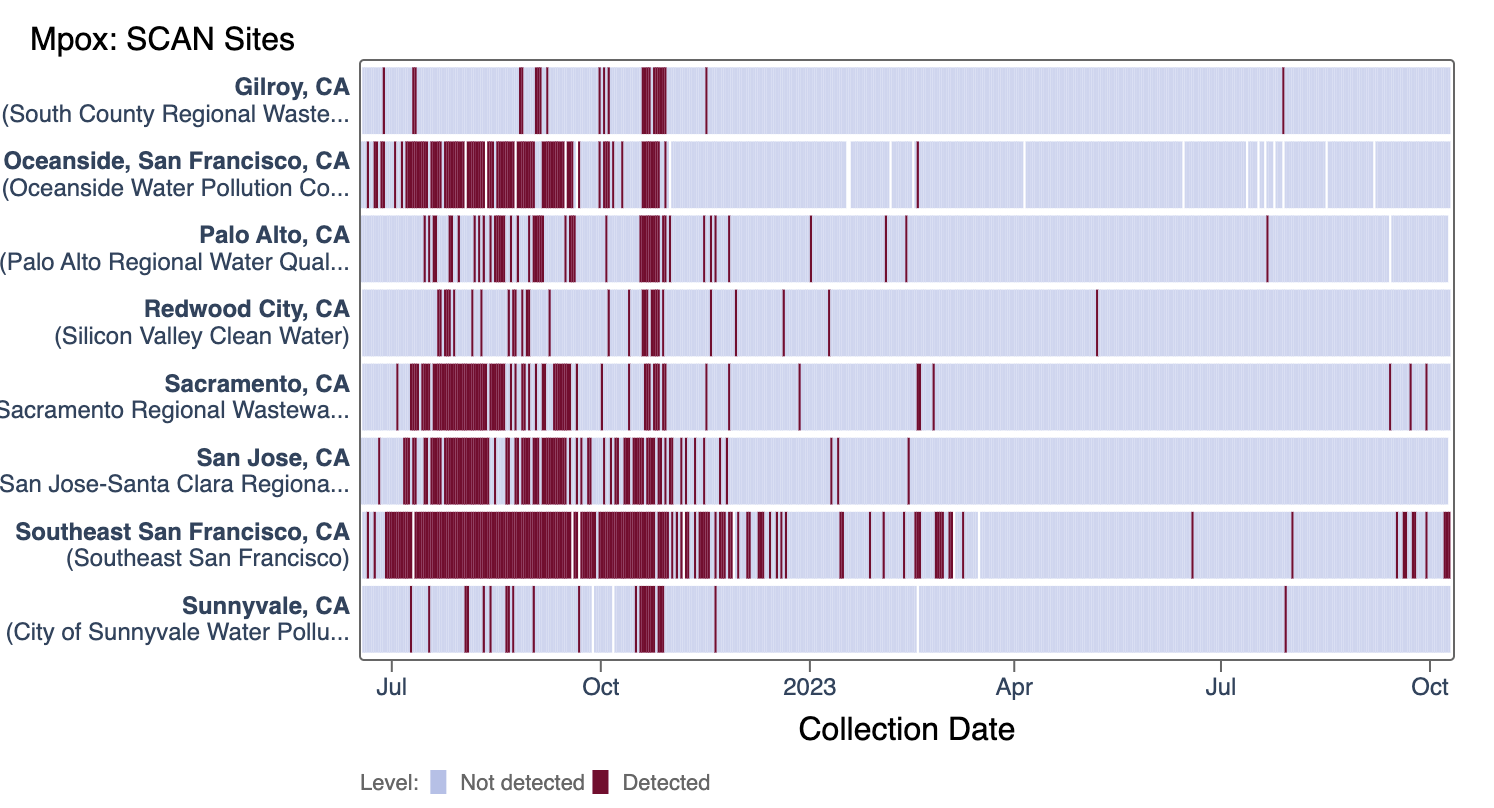 Mpox DNA was mostly non-detect in the last 21 days for SCAN plants except for Southeast SF and Sacramento which have had sporadic detects over the past 21 days. The heat map below shows all the SCAN sites as a row, and each date as a column. The color blue means that MPXV DNA was not detected in the sample, and the colors get darker with higher concentrations. White indicates no sample was collected. The chart shows all the data we have collected. You can access the chart here.