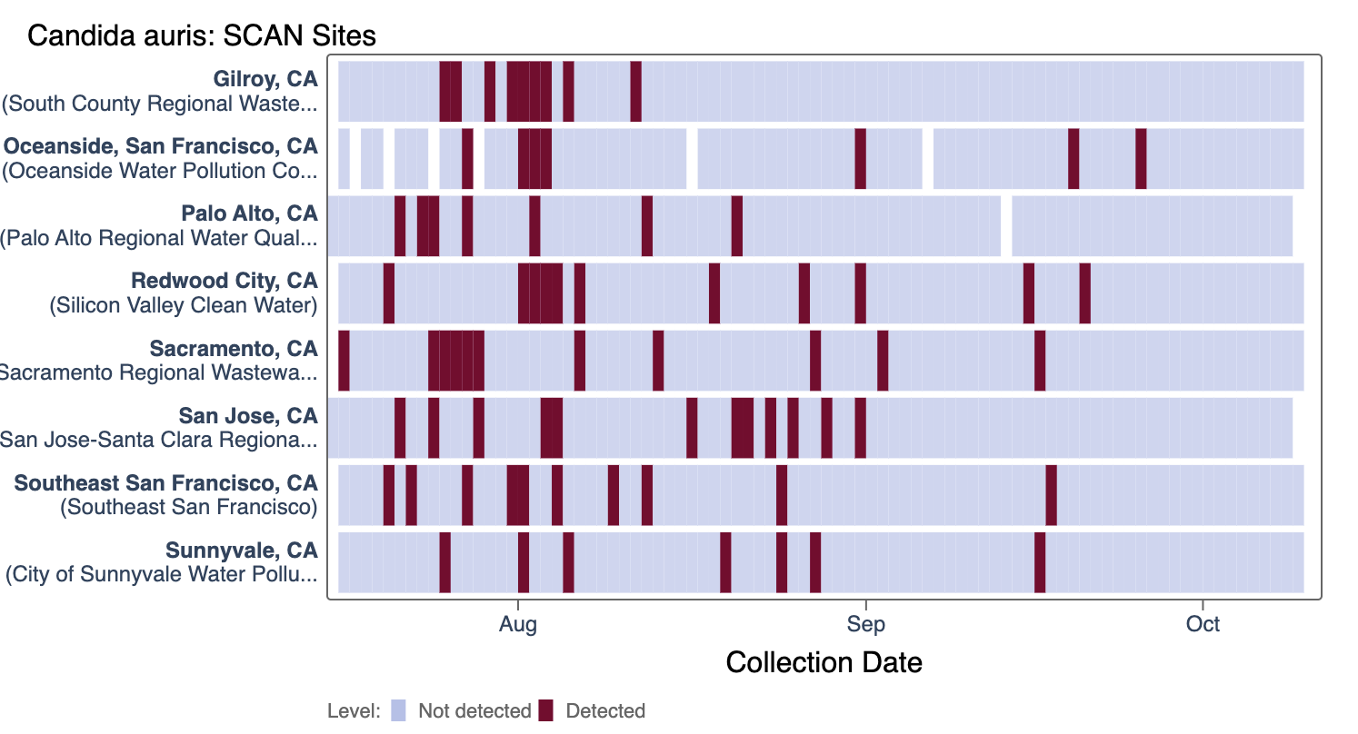 Candida auris DNA was not detected in most samples collected in the last 21 days at SCAN sites. The heat map below shows all the SCAN sites as a row, and each date as a column for all data collected since monitoring began in July. The color blue means that Candida auris DNA was not detected in the sample, and the colors get darker with higher concentrations. White indicates no sample was collected. You can access the chart here.
