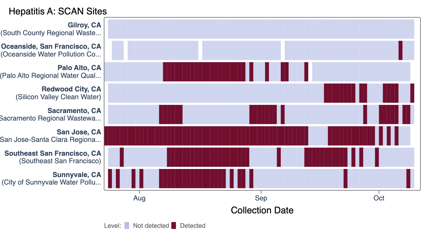 Hepatitis A RNA was sporadically detected in samples collected in the last 21 days at most SCAN sites. However, throughout the full monitoring period so far, San Jose has had mostly detects for Hepatitis A RNA while Gilroy and Oceanside SF have had mostly non-detects. The heat map below shows all the SCAN sites as a row, and each date as a column for all data collected since monitoring began in July. The color blue means that Hepatitis A RNA was not detected in the sample, and the colors get darker with higher concentrations. White indicates no sample was collected. You can access the chart here.