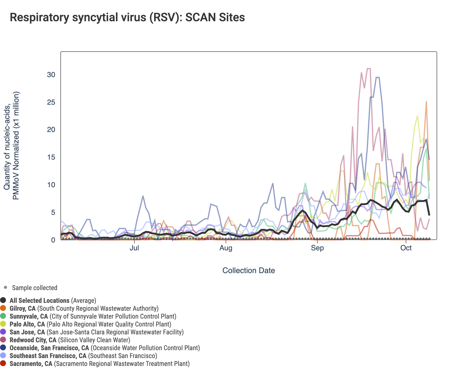 RSV RNA concentrations have increased for most SCAN sites since the beginning of September, as can be seen below. In the chart, the population weighted average line across all the SCAN plants is shown in black for all SCAN plants since June. Five sites have met the benchmark for onset (Palo Alto, San Jose, Southeast SF, Sunnyvale, and Oceanside SF).