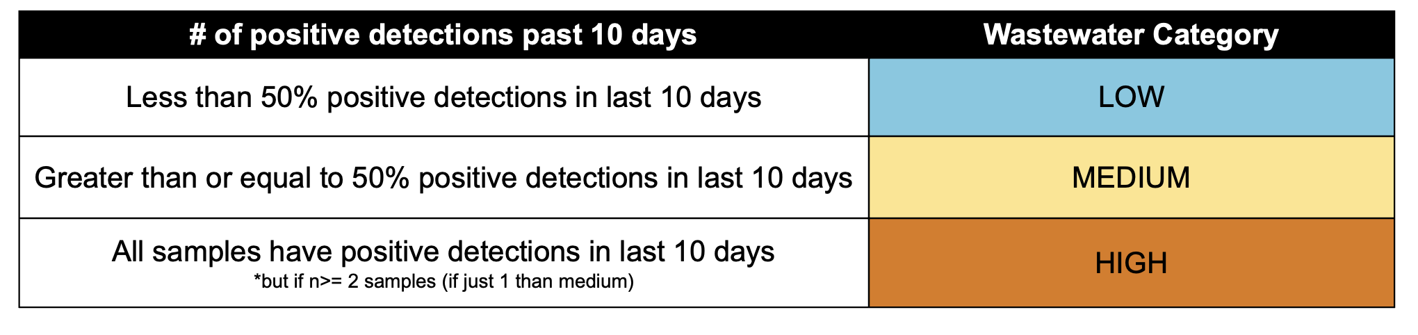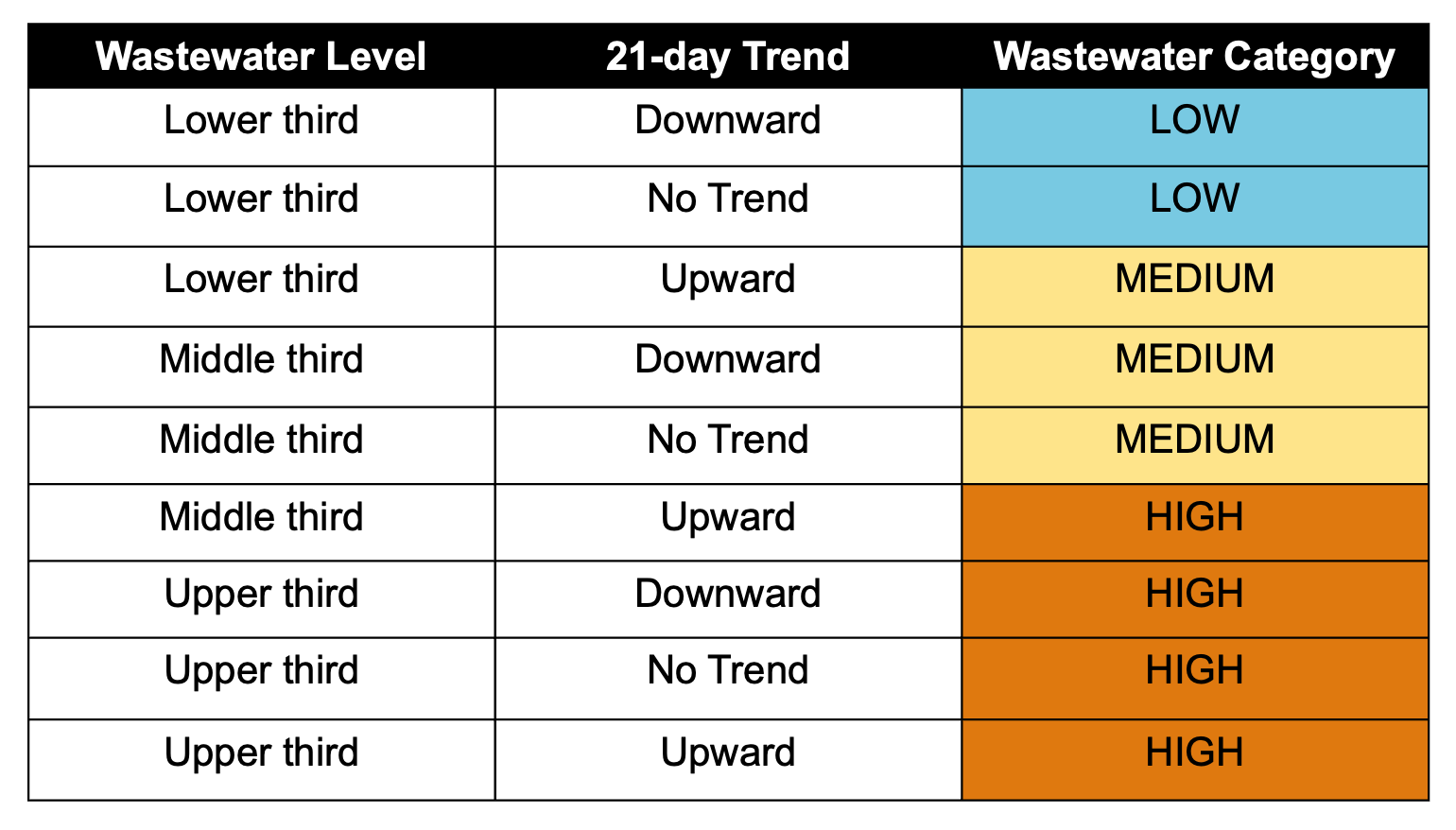 WastewaterSCAN uses a Wastewater Categorization system to communicate insights from recent wastewater results. Research shows that the measurements we make in wastewater are related to disease in the community. The wastewater categorization helps us quickly understand if the recent measurements for a disease fall into a low, medium, or high category and are determined based on a combination of the following variables: