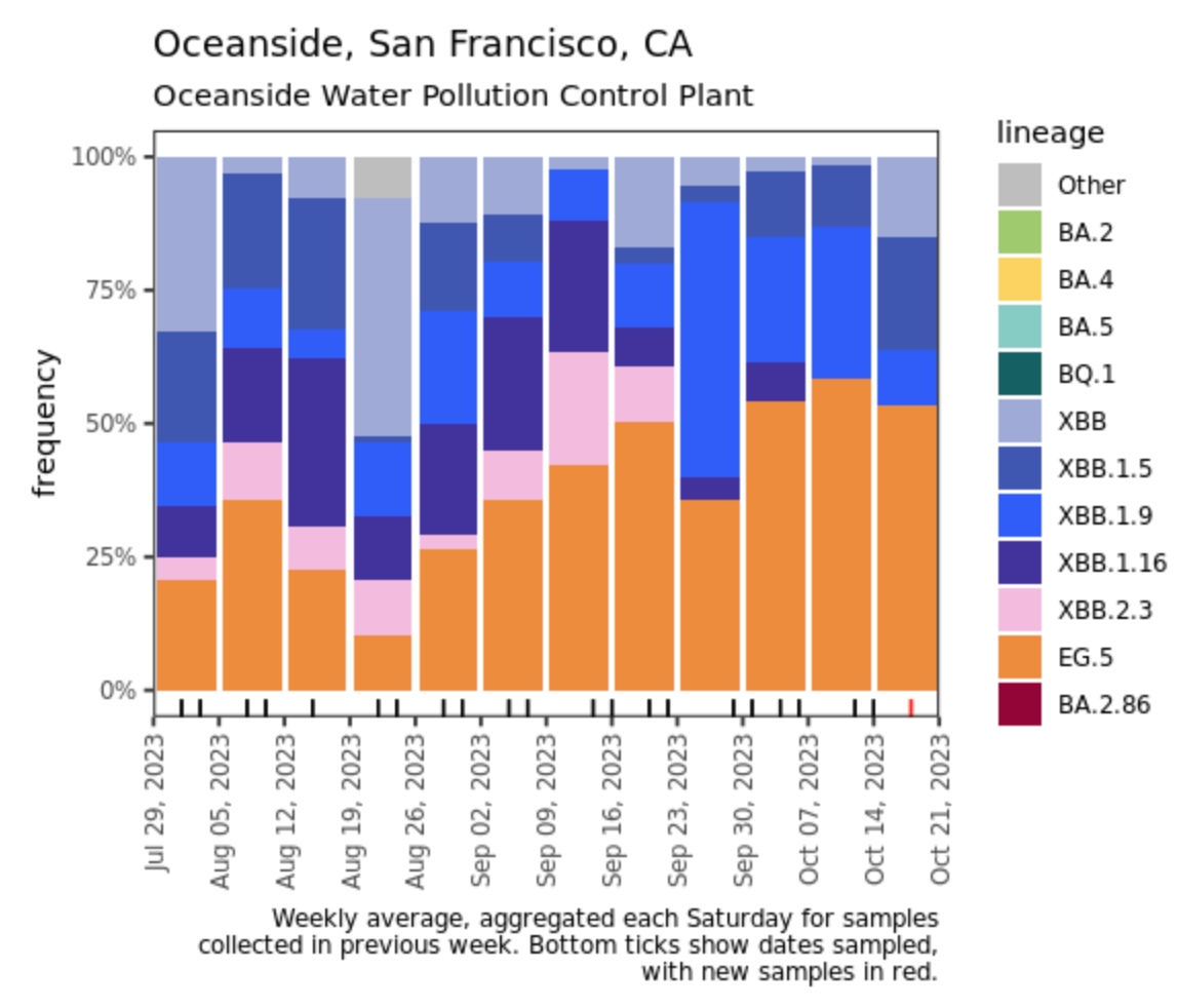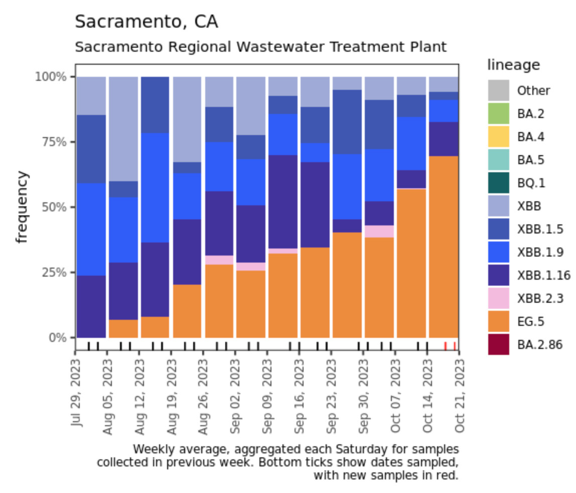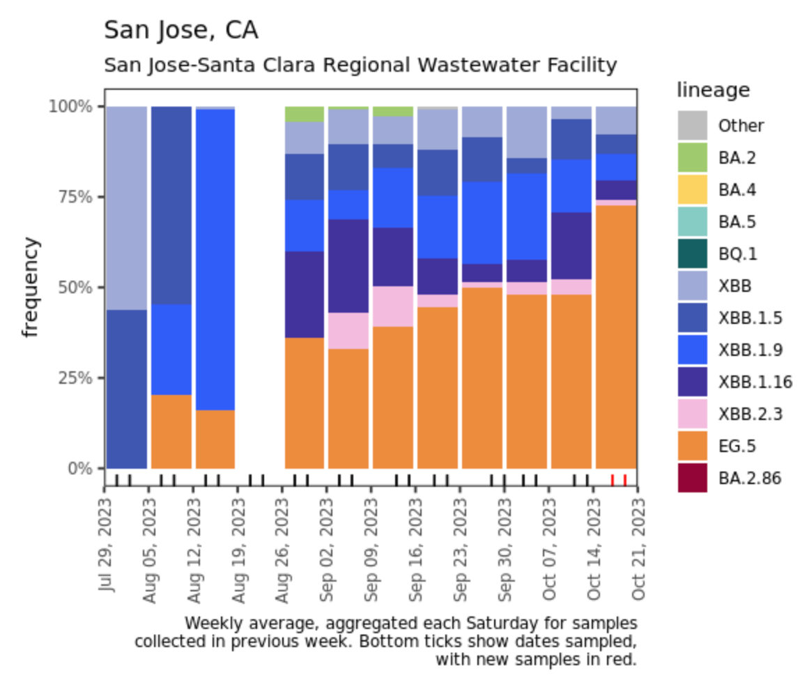 Below are plots from Oceanside, Sacramento, and San Jose showing the relative proportions of different variants inferred from sequencing the entire genome of SARS-CoV-2. Samples with low coverage are not being displayed in the plots (this explains the empty column for San Jose). In the most recent samples, you can see that Sacramento and San Jose were approaching 75% of the sublineage EG.5 (in orange) while Oceanside was ~50% of the sublineage EG.5. In the last sequencing run, we did not detect BA.2.86 in wastewater from any SCAN sites. Note that the sequencing data are always from samples taken between 1- 2 weeks ago.