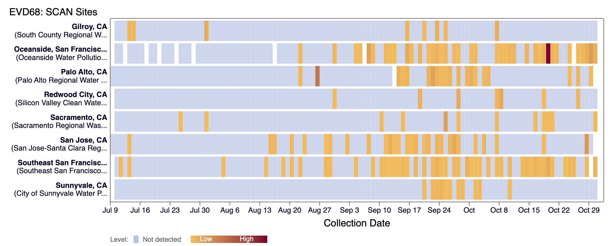 EV-D68 RNA was sporadically detected in samples collected in the last 21 days at most SCAN sites. However, at Oceanside SF and Southeast SF, EV-D68 was detected in most samples collected in the last 21 days. The heat map below shows all the SCAN sites as a row, and each date as a column since monitoring began in July. The color blue means the sample was non-detect for EV-D68 RNA and the colors get darker with higher concentrations. White indicates no sample was collected. You can access the chart here. EV-D68 is believed to occur biennially, and we saw it last year, so perhaps it will not be common this year.
