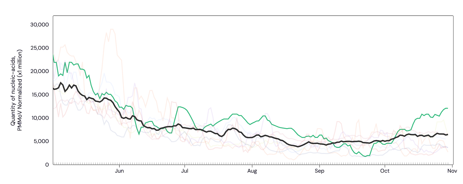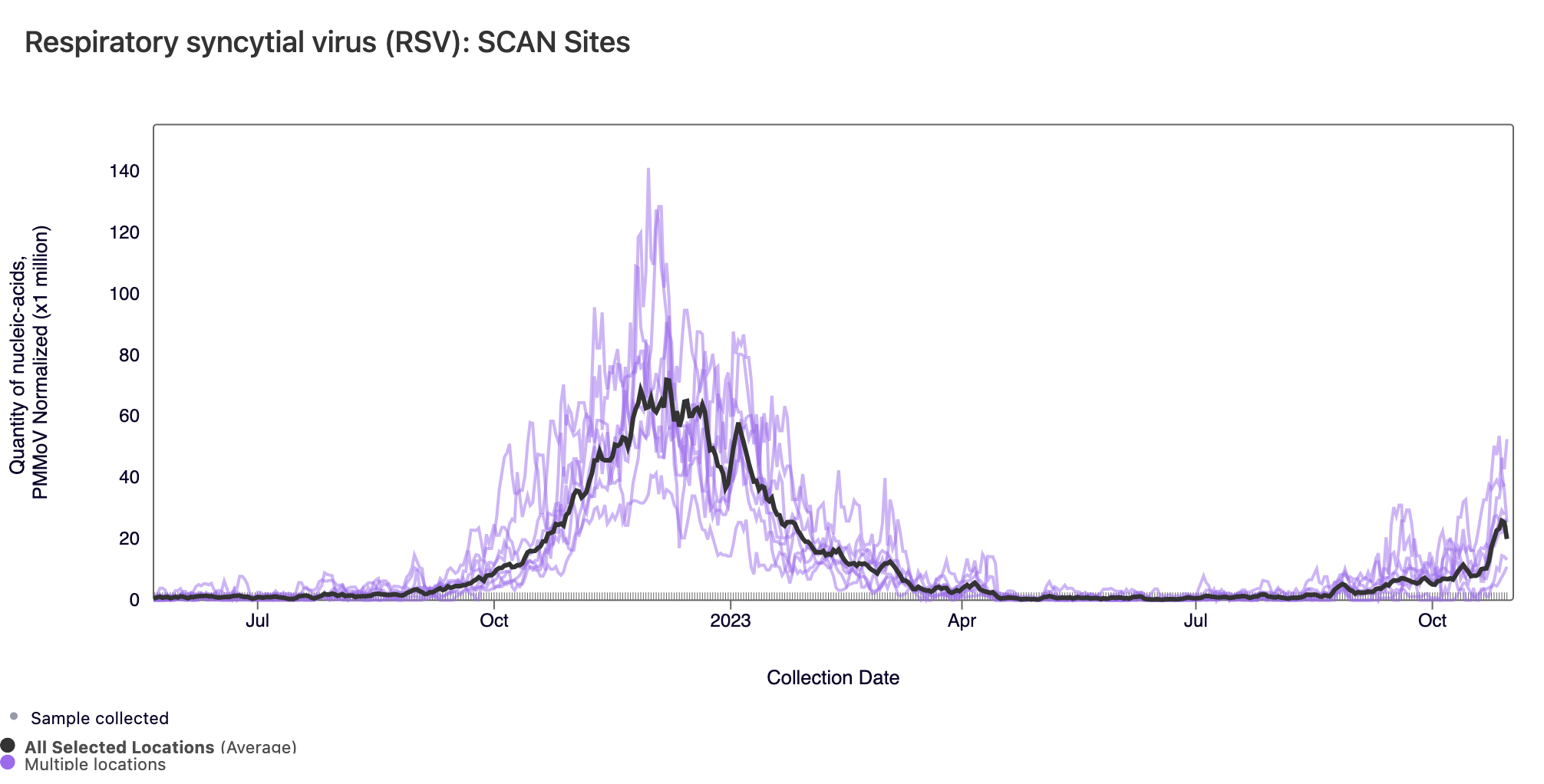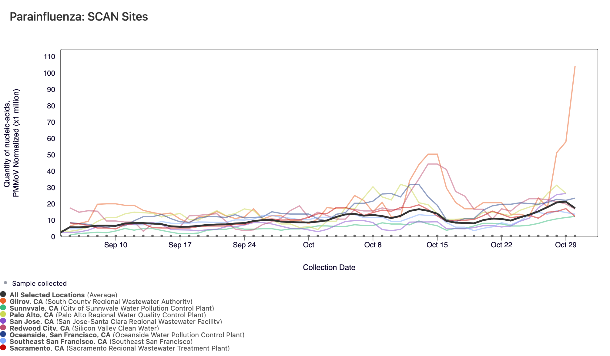 Parainfluenza RNA has been detected in most samples collected from SCAN sites. The population weighted average line is shown in black. You can access the chart here.
