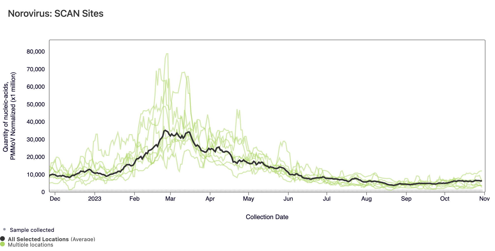 The plot below shows the Norovirus concentrations since last February at the SCAN sites. The population weighted average line is shown in black. You can interact with the chart of all the plants at this link.