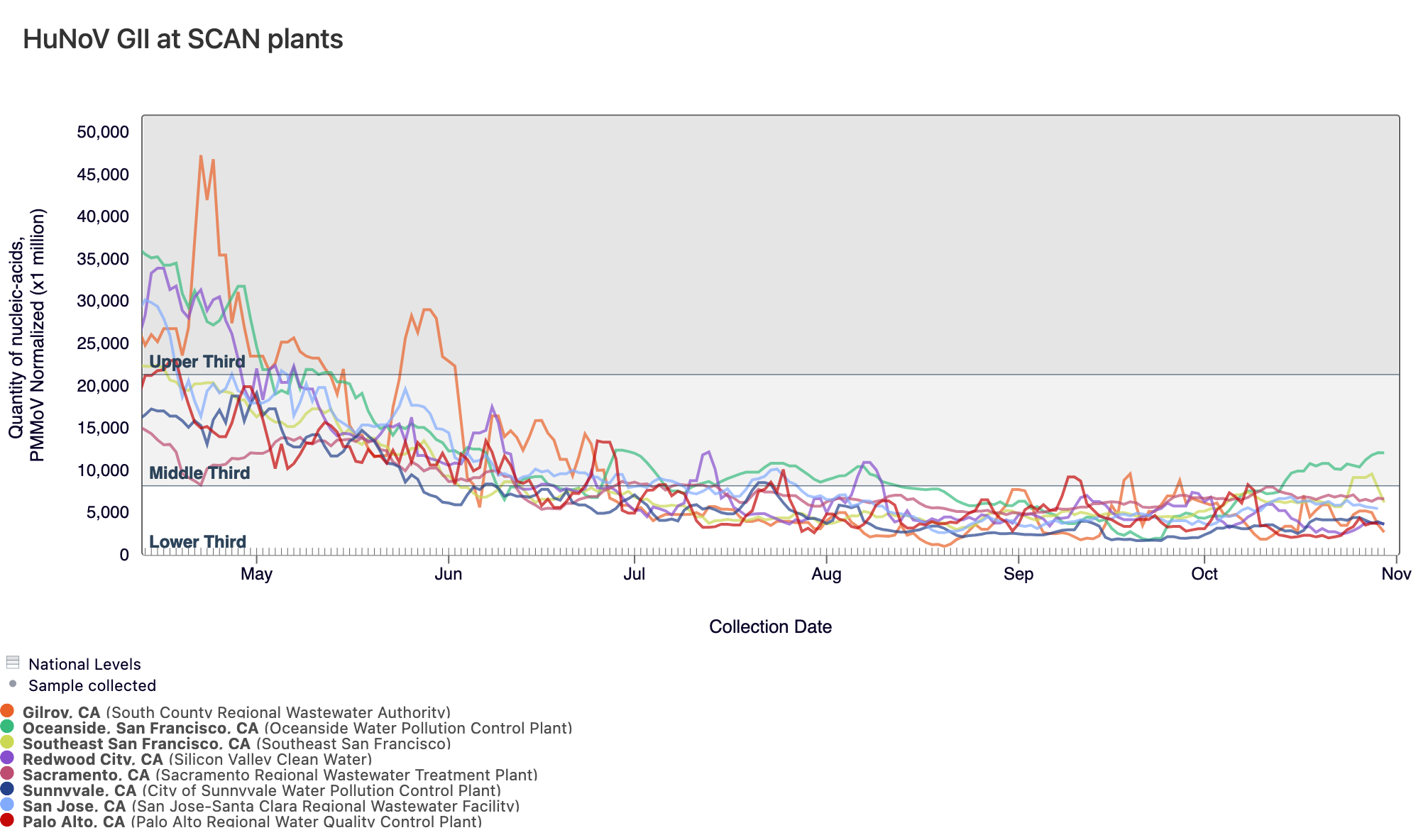Below is a chart showing the National Levels benchmarks superimposed on the Norovirus concentrations from the SCAN sites since the beginning of 2023. (You can access the chart here.) Currently all SCAN sites HuNoV GII concentrations in the lower third level except for Oceanside SF which is in the middle third.