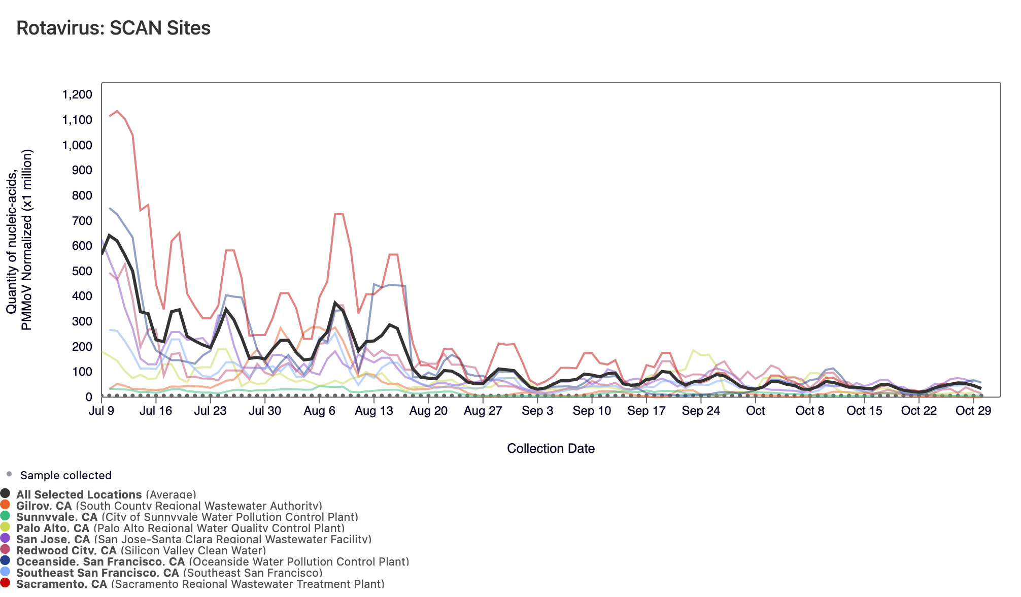 Rotavirus RNA concentrations are shown in the chart below; all the SCAN plants are shown together. The population weighted average line is shown in black. You can interact with the chart of all the plants here.