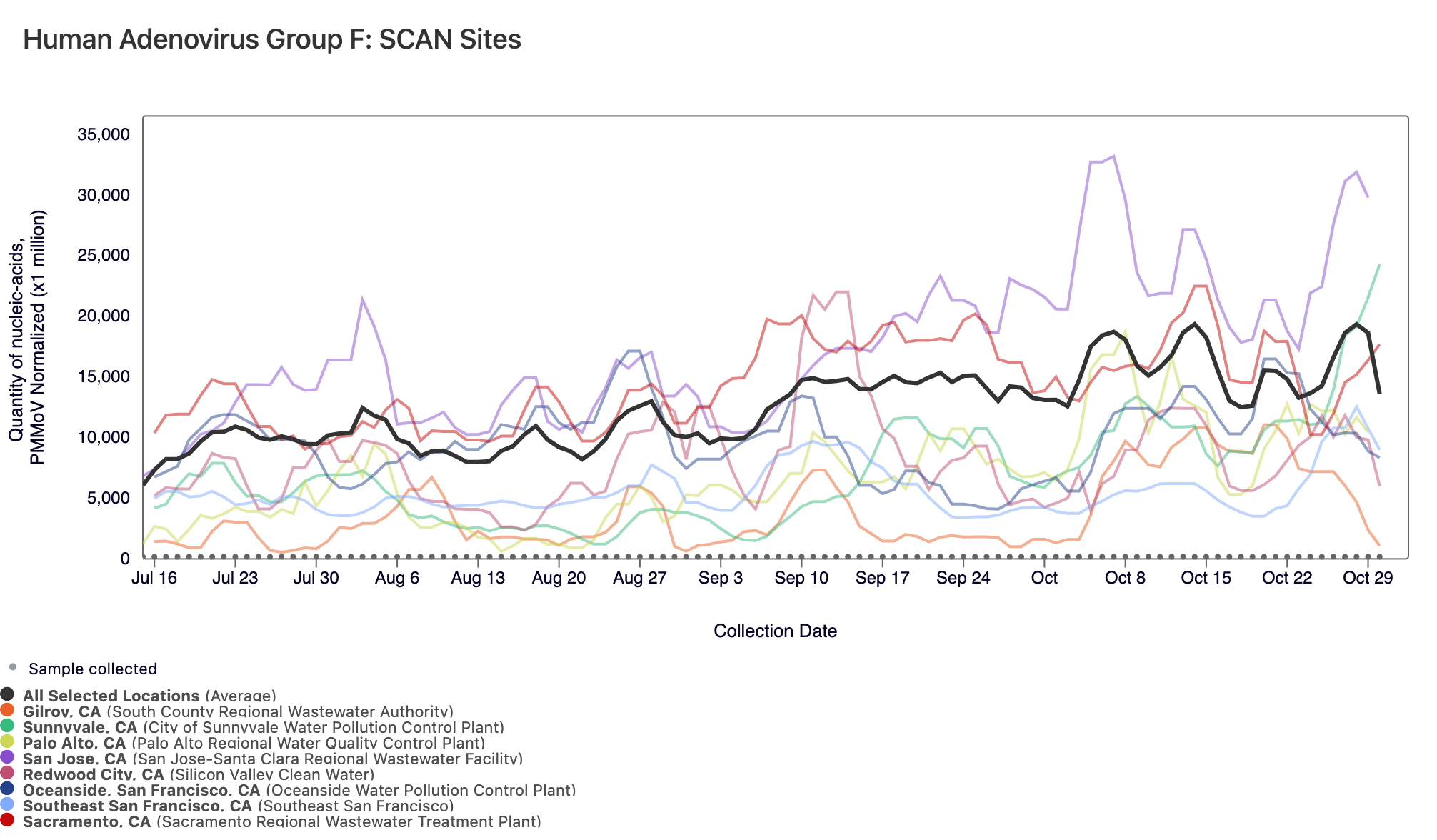 Human Adenovirus Group F DNA concentrations are shown in the chart below; all the SCAN plants are shown together. The population weighted average line is shown in black. You can interact with the chart of all the plants here.