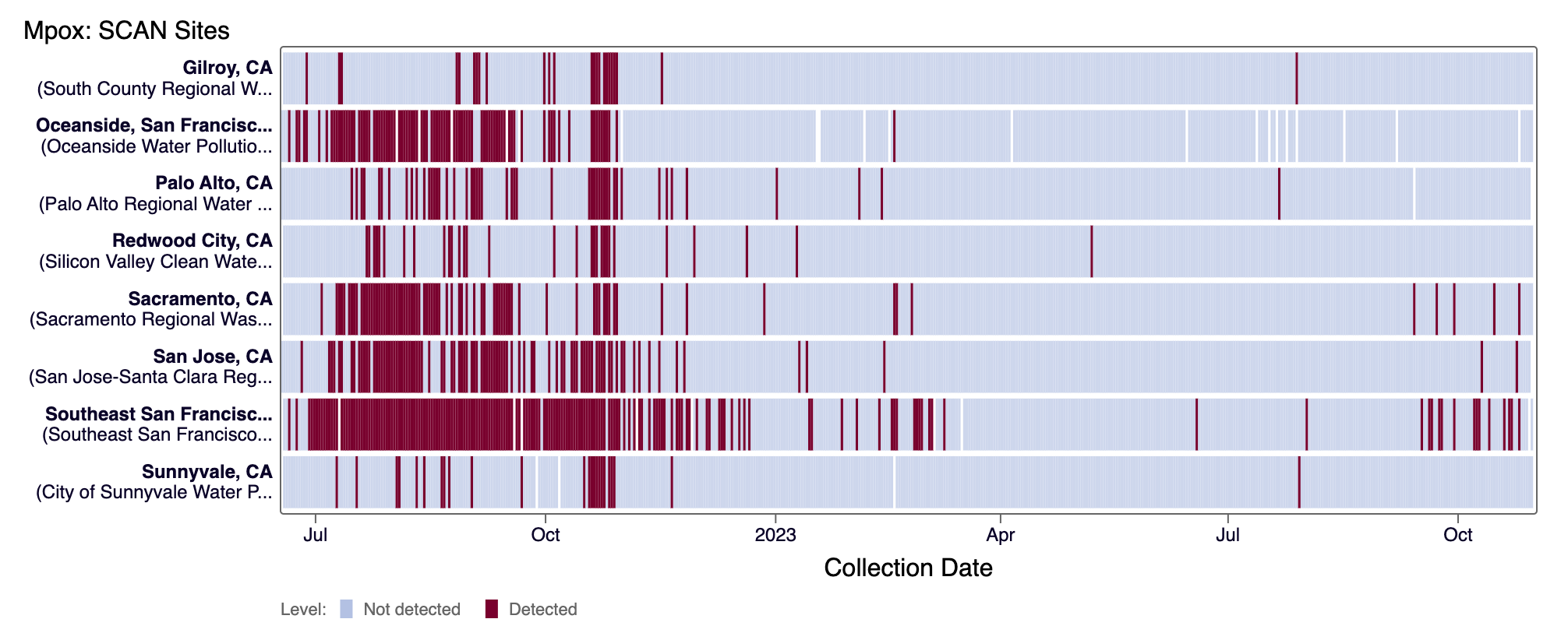 Mpox DNA was was not detected in most samples collected in the last 21 days at most SCAN sites. However, at Southeast SF Mpox DNA was detected sporadically in the last 21 days. The heat map below shows all the SCAN sites as a row, and each date as a column since July 2022. The color blue means that MPXV DNA was not detected in the sample, and the dark purple color means it was detected. White indicates no sample was collected. The chart shows all the data we have collected. You can access the chart here.