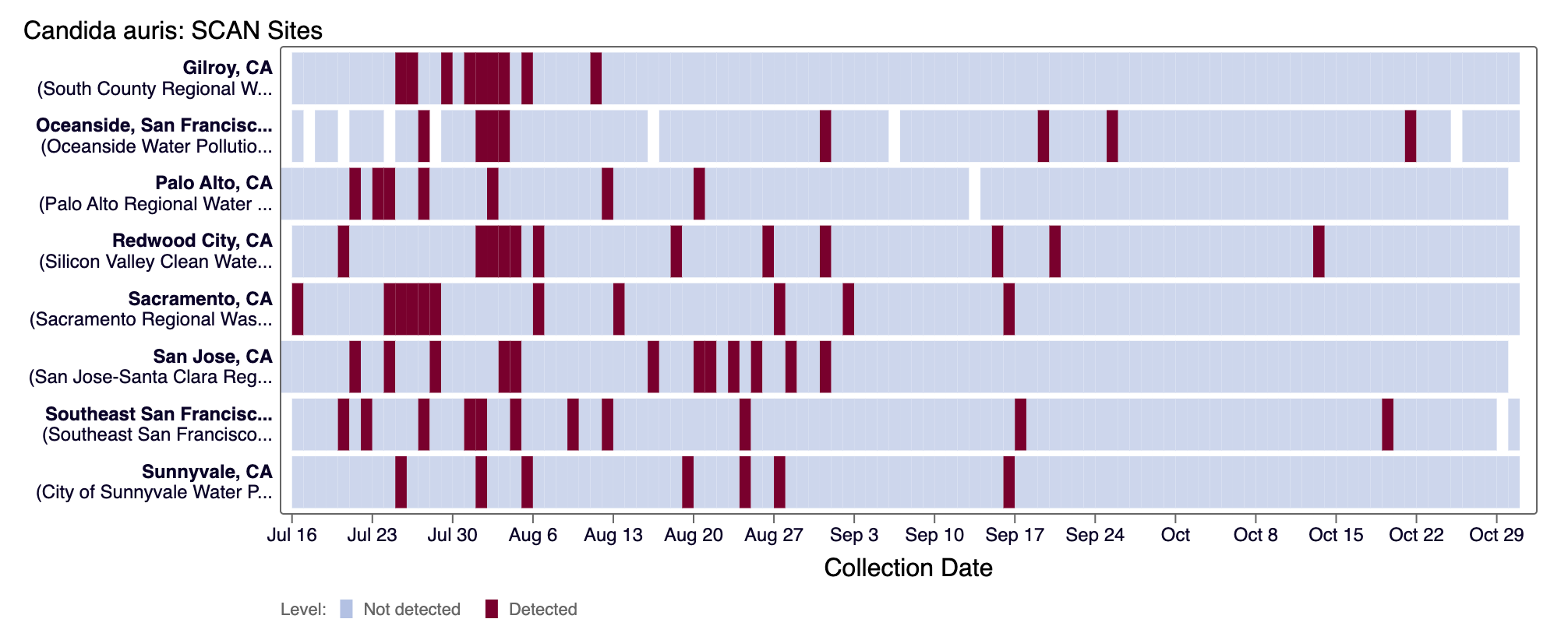 Candida auris DNA was not detected in most samples collected in the last 21 days at SCAN sites. The heat map below shows all the SCAN sites as a row, and each date as a column for all data collected since monitoring began in July. The color blue means that Candida auris DNA was not detected in the sample, and the dark purple color means it was detected. White indicates no sample was collected. You can access the chart here.