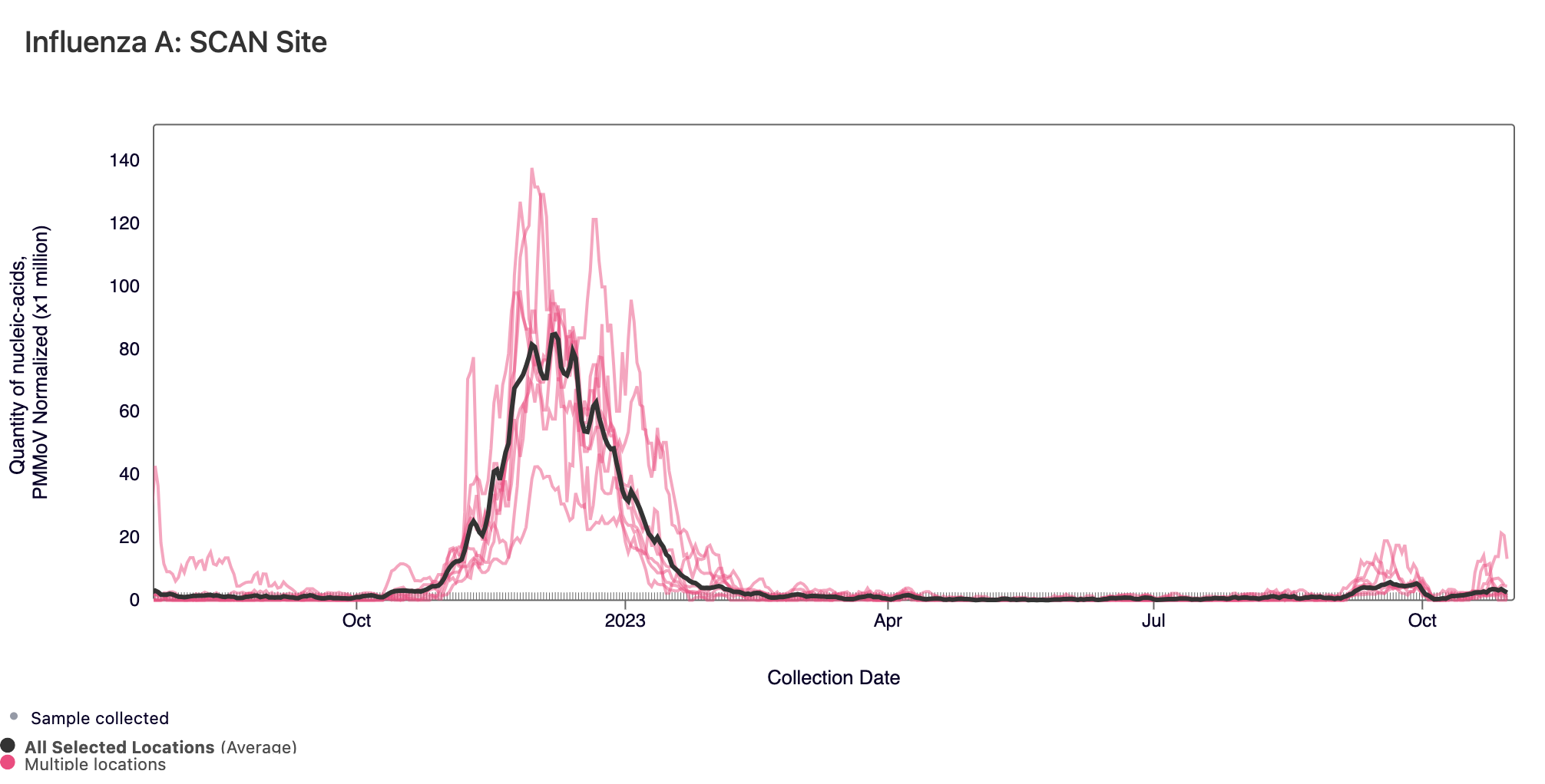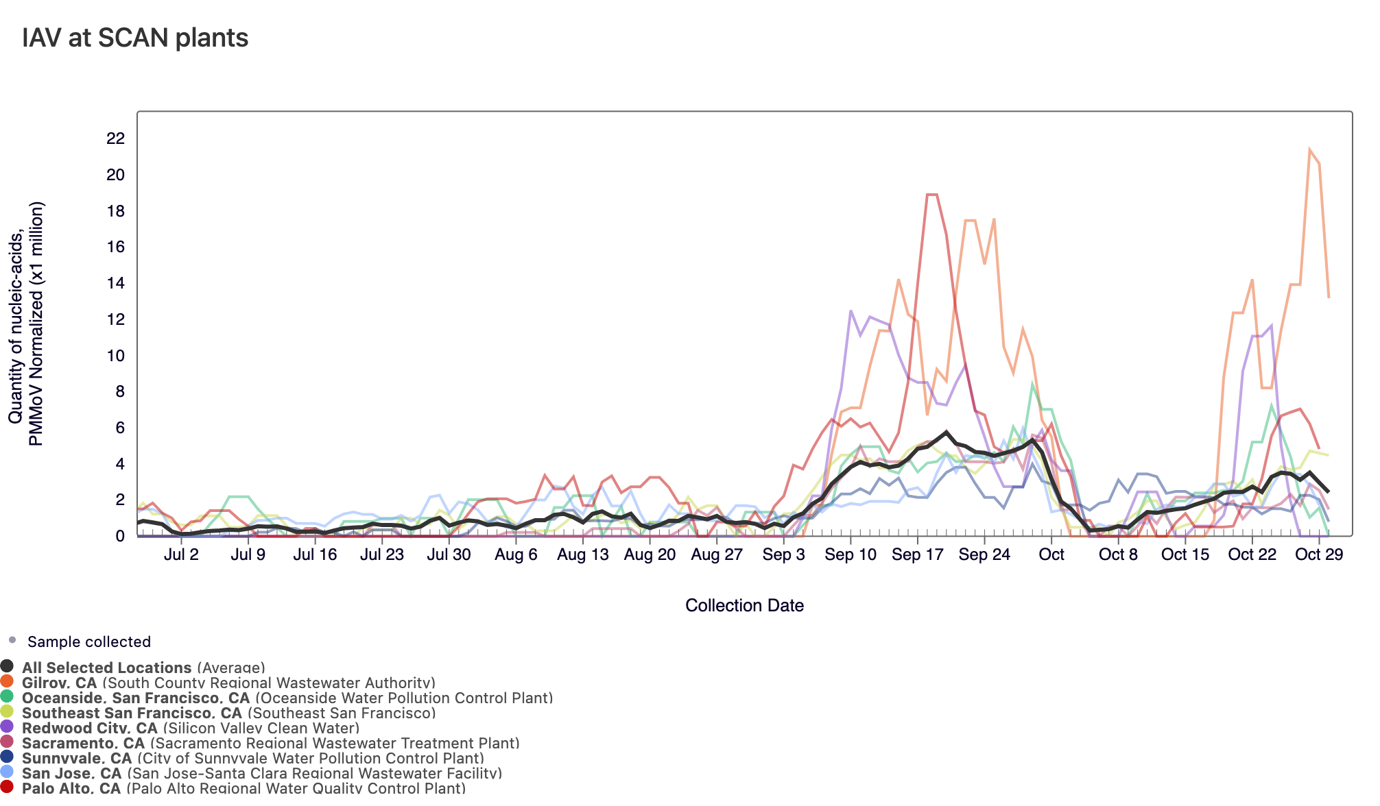 Influenza A (IAV) RNA concentrations are increasing across SCAN sites, as can be seen below, particularly at Gilroy and Redwood City. In the chart below, the population weighted average line across all the SCAN plants is shown in black for all SCAN plants since July. Two sites have met the benchmark for onset (Sacramento and Palo Alto).
