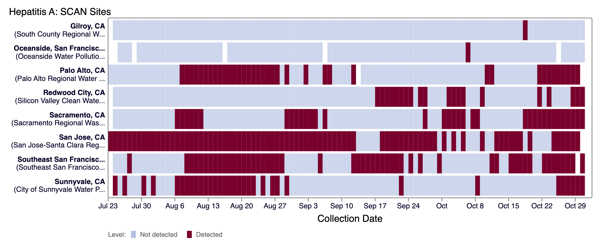 Hepatitis A RNA was detected in most samples from Sacramento, San Jose, and Southeast SF; detected sporadically at Palo Alto, Redwood City, and Sunnyvale; and detected infrequently at Oceanside SF and Gilroy in the last 21 days. The heat map below shows all the SCAN sites as a row, and each date as a column for all data collected since monitoring began in July. The color blue means that Hepatitis A RNA was not detected in the sample, and the dark purple color means it was detected. White indicates no sample was collected. You can access the chart here.