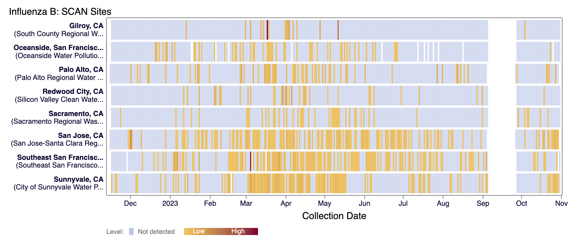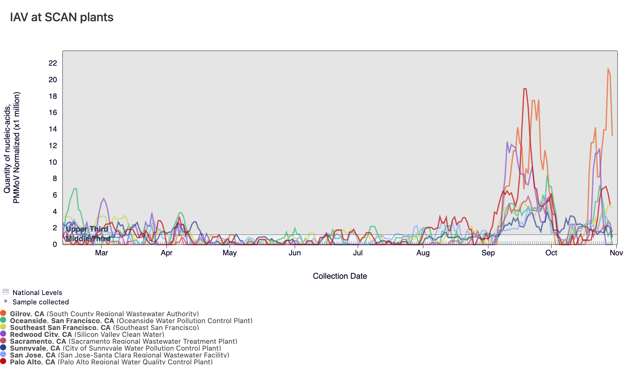 Below is a chart showing the National Levels benchmarks superimposed on the IAV data from the SCAN sites since the beginning of 2023 (you can access this chart here). Currently, Sunnyvale, Oceanside SF, and SVCW have IAV concentrations in the middle third level and all other SCAN sites have IAV concentrations in the upper third level.