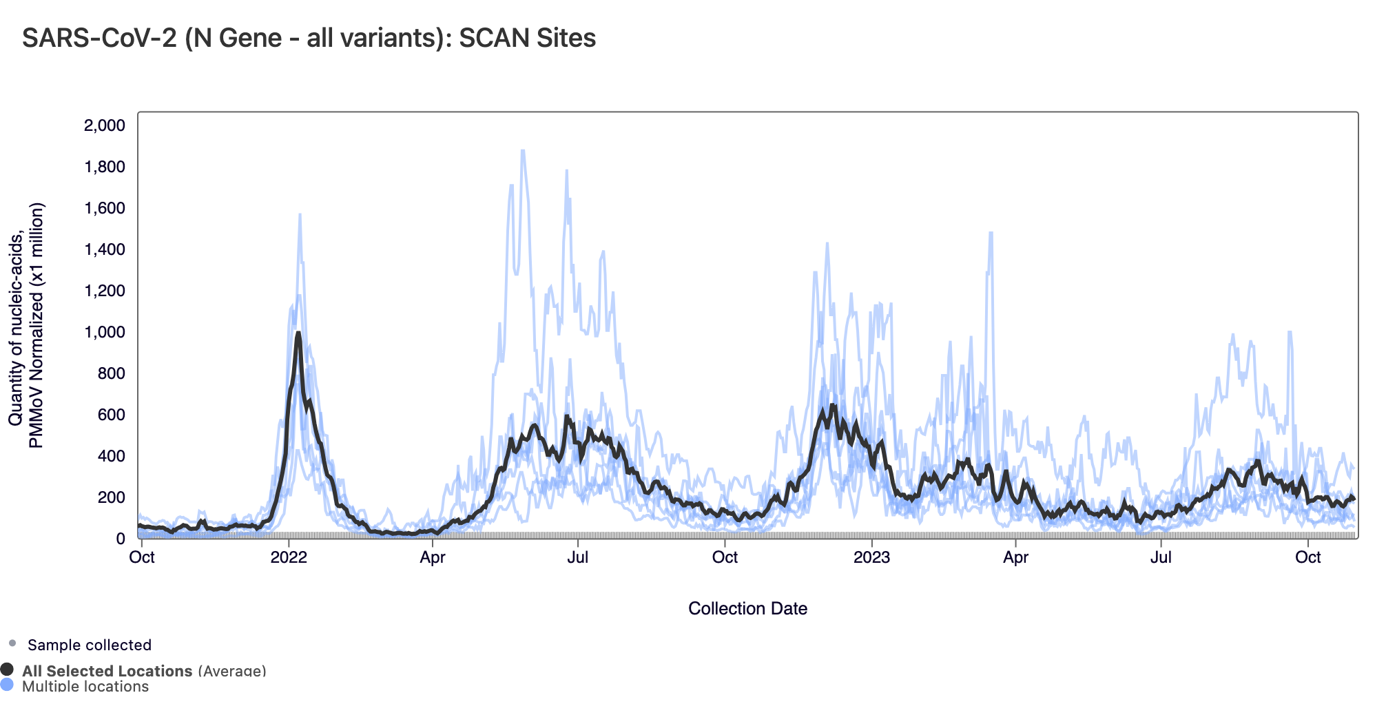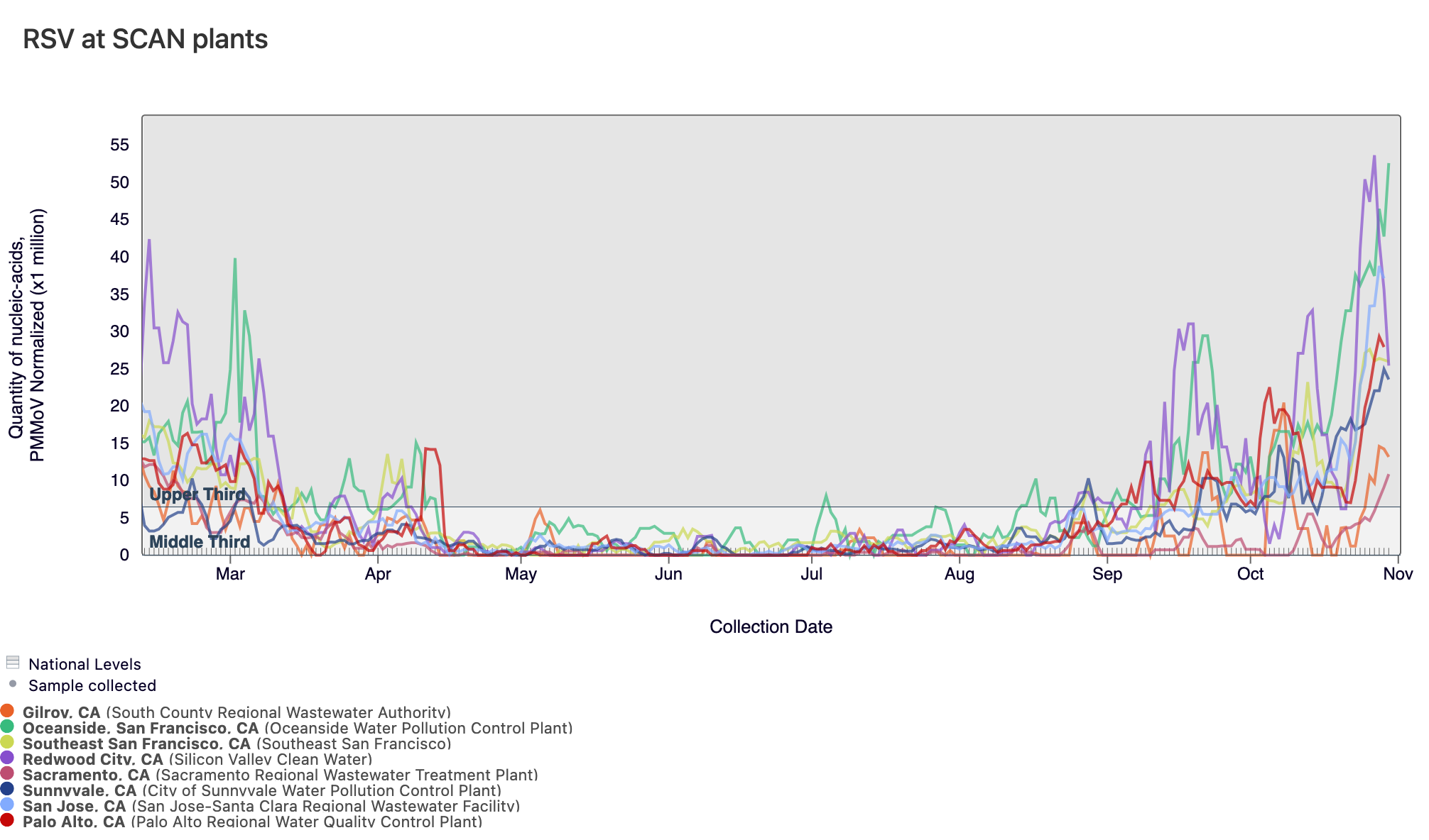 Below is a chart showing the National Levels benchmarks superimposed on the RSV data from the SCAN sites since the beginning of 2023 (you can access this chart here). Currently, Gilroy, Palo Alto, and and Sacramento are in the middle third and all other SCAN sites have RSV concentrations in the upper third level.