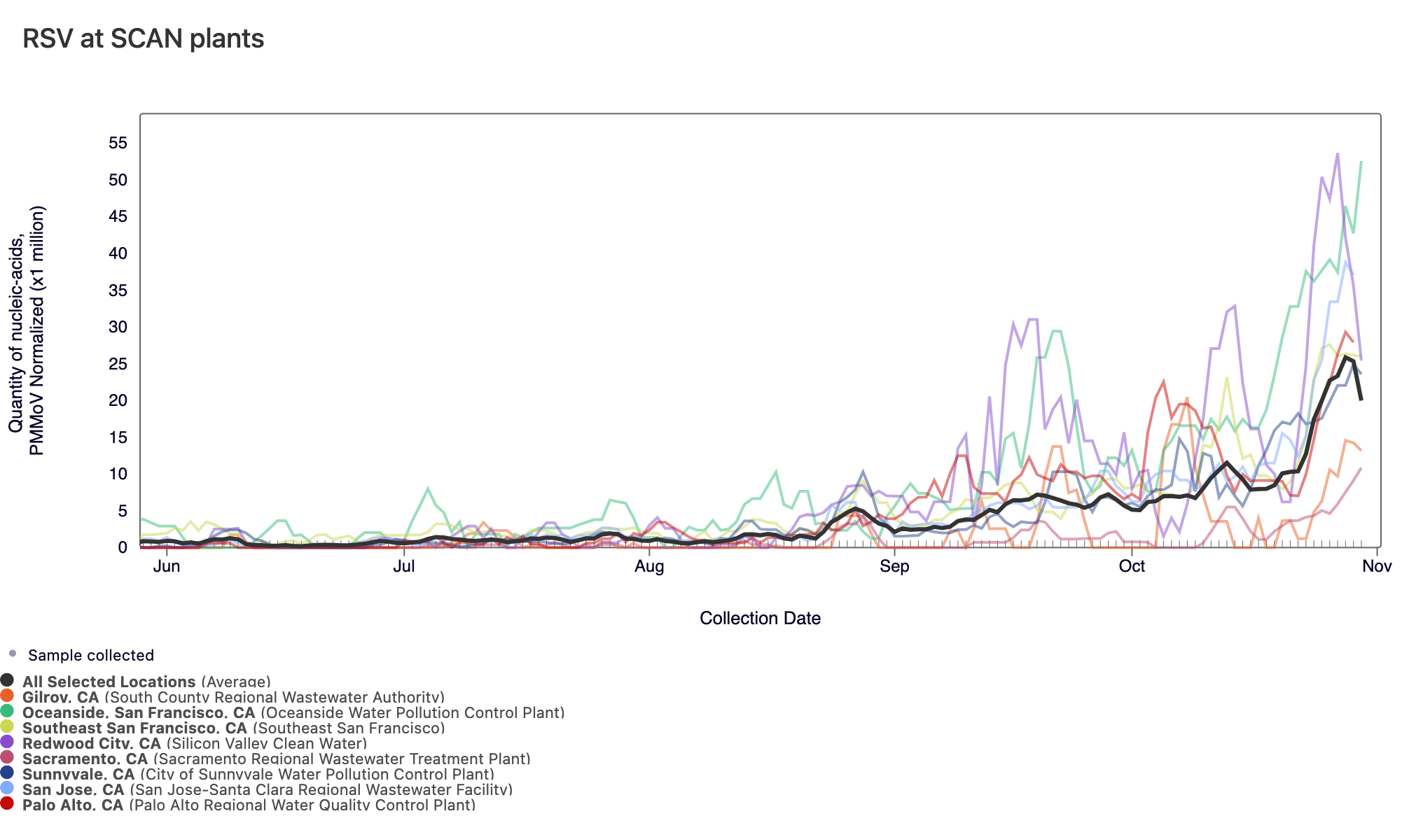 RSV RNA concentrations have increased for most SCAN sites since the beginning of September, as can be seen below. In the chart, the population weighted average line across all the SCAN plants is shown in black for all SCAN plants since June. Five sites have met the benchmark for onset (Palo Alto, San Jose, Southeast SF, Sunnyvale, and Oceanside SF).