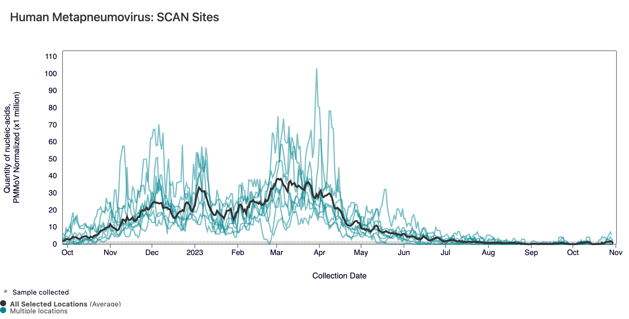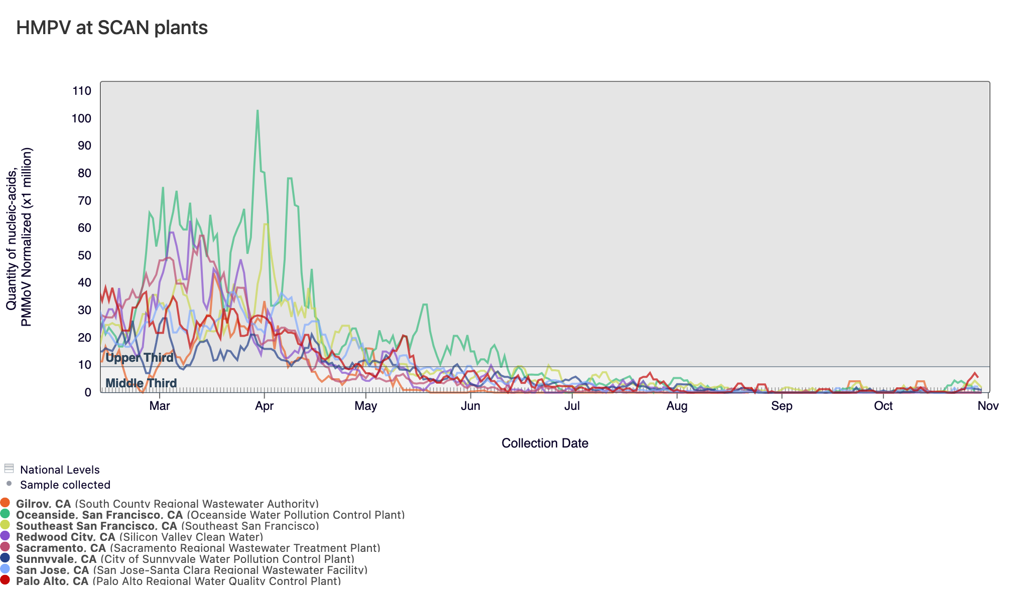Below is a chart showing the National Levels benchmarks superimposed on the HMPV data from the SCAN sites since the beginning of 2023. (You can access the chart here.) Currently all SCAN sites have HMPV concentrations in the middle third level.