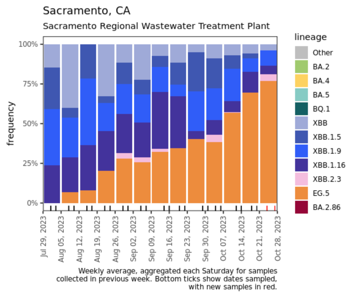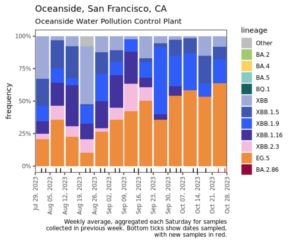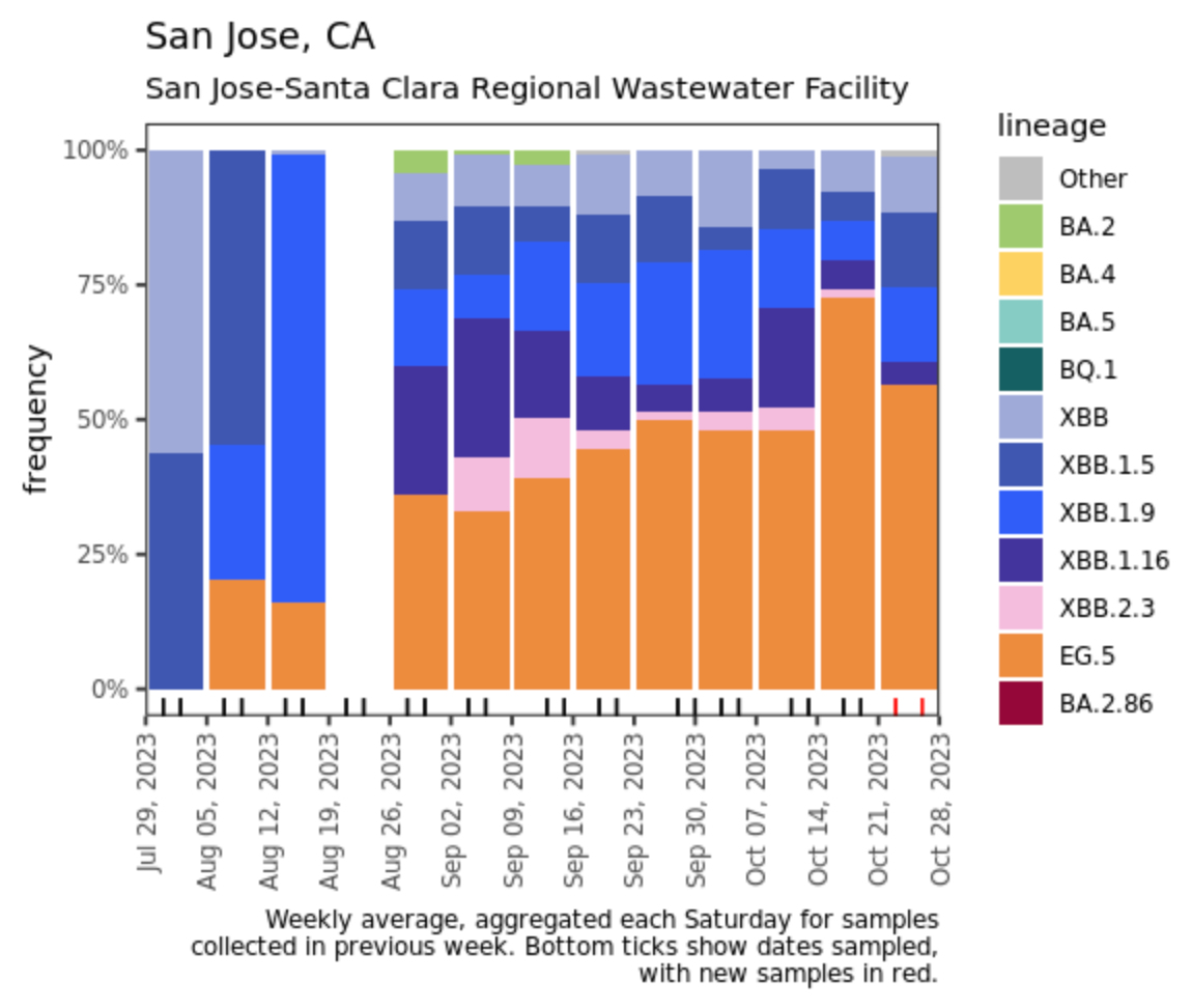 Below are plots from Oceanside SF, Sacramento, and San Jose showing the relative proportions of different variants inferred from sequencing the entire genome of SARS-CoV-2. Samples with low coverage are not being displayed in the plots (this explains the empty column for San Jose). In the most recent samples, you can see that Oceanside SF and Sacramento were approaching 75% of the sublineage EG.5 (in orange) while San Jose was >50% of the sublineage EG.5. In the last sequencing run, we did not detect BA.2.86 in wastewater from any SCAN sites. Note that the sequencing data are always from samples taken between 1- 2 weeks ago.