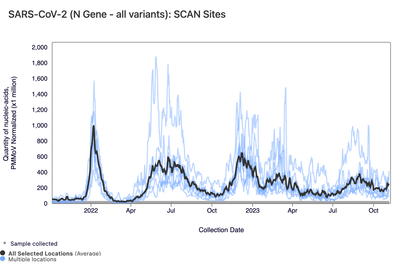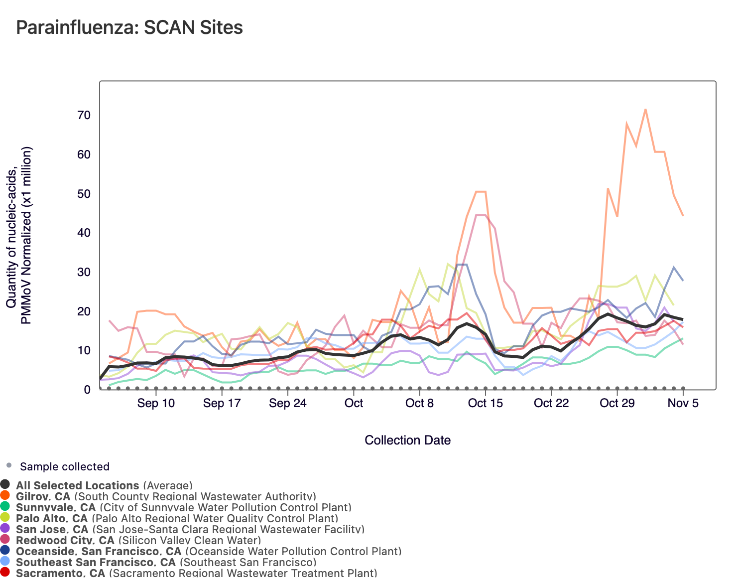 Parainfluenza RNA has been detected in most samples collected from SCAN sites. The population weighted average line is shown in black. You can access the chart here.