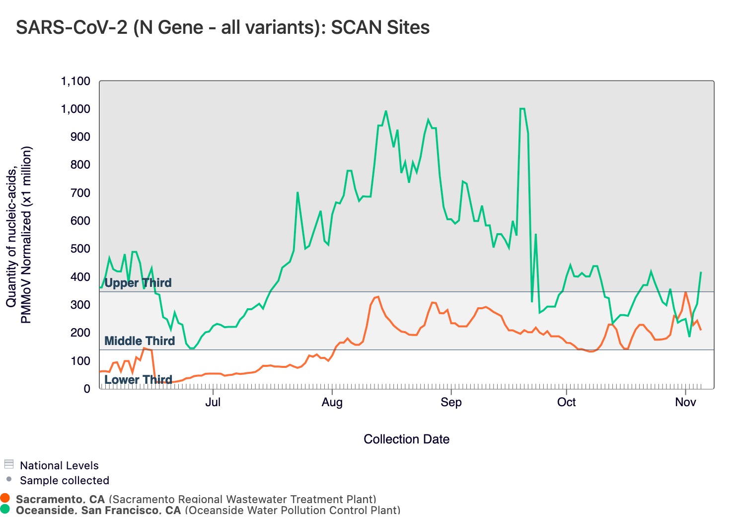 SARS-CoV-2 N gene concentrations are between 10,000 and ~100,000 copies/g. Below is a chart showing the National Levels benchmarks superimposed on the SARS-CoV-2 data from Oceanside SF and Sacramento since the beginning of June.