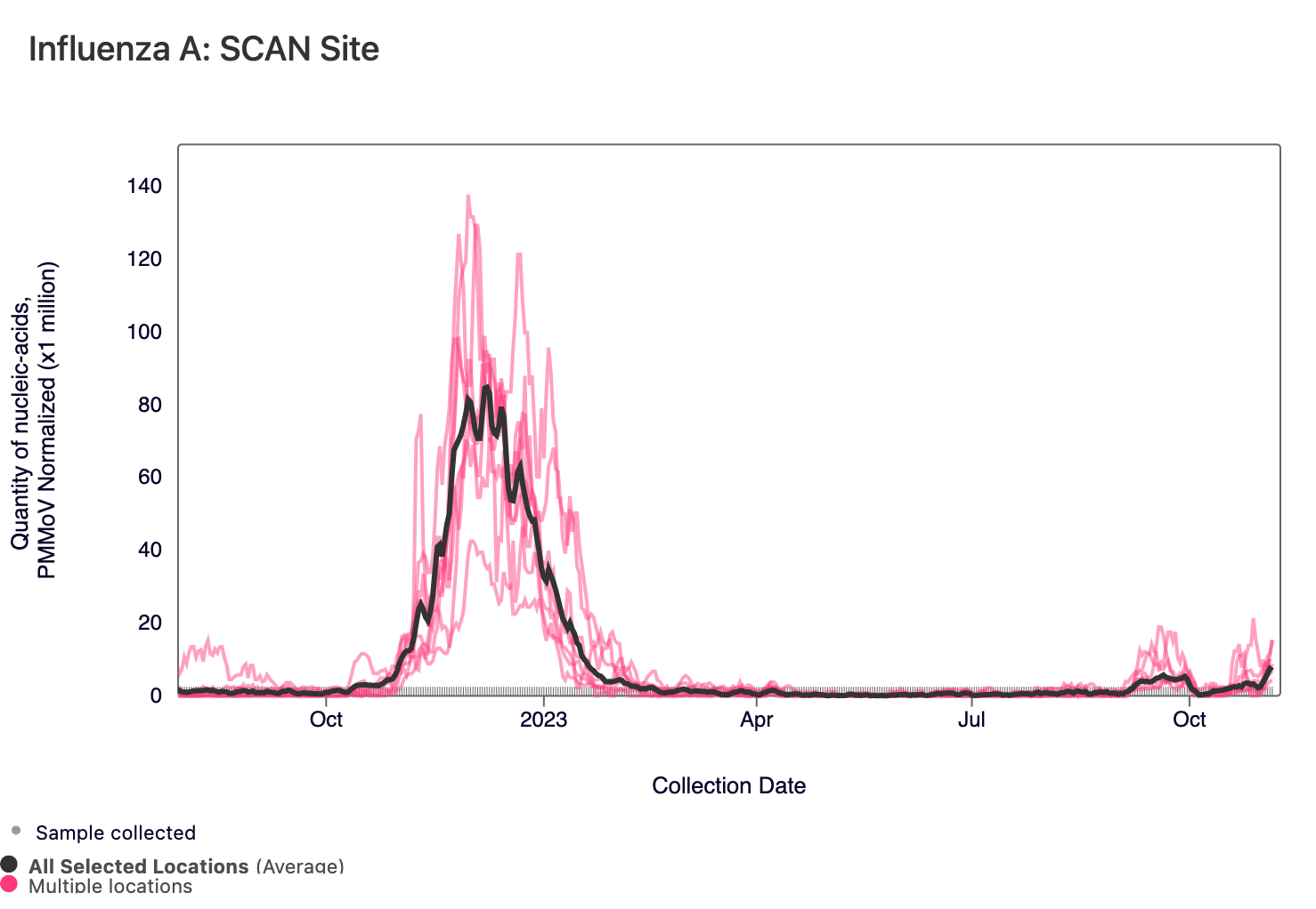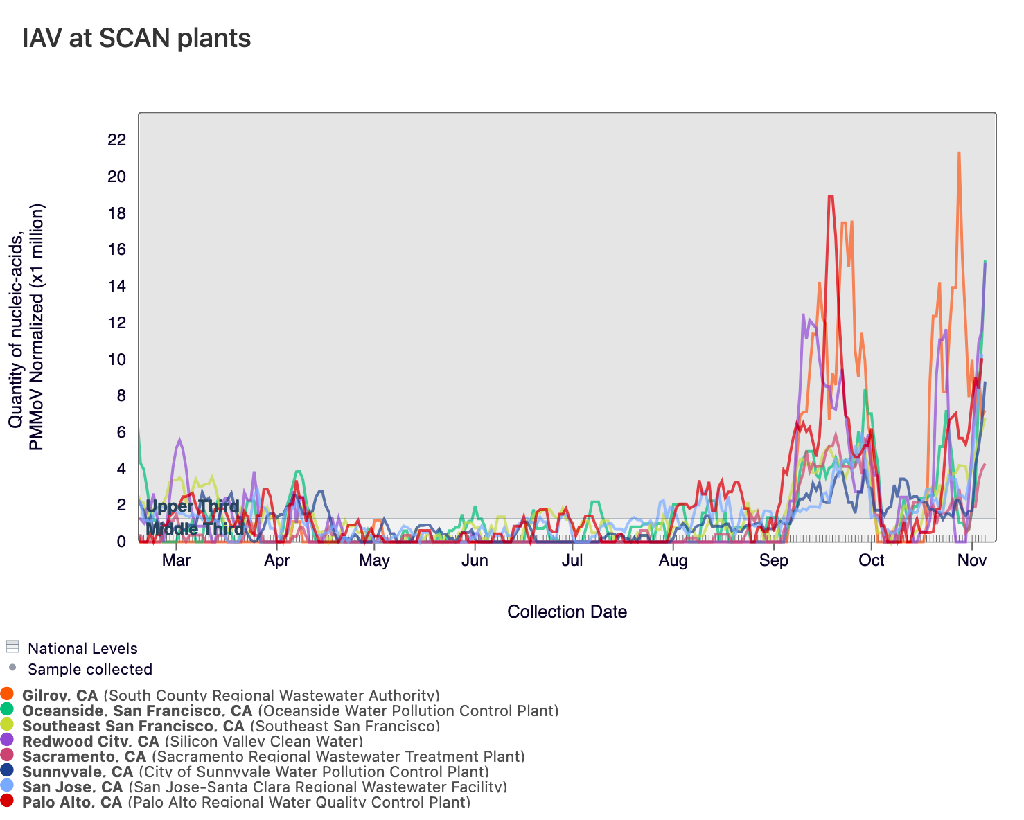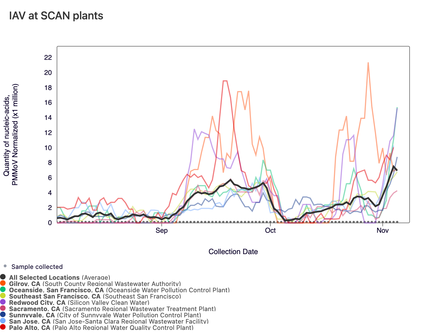 Influenza A (IAV) RNA concentrations are increasing across all SCAN sites, as can be seen below, but so far only two sites have met the benchmark for onset (Sacramento and Palo Alto). In the chart below, the population weighted average line across all the SCAN plants is shown in black for all SCAN plants since August.