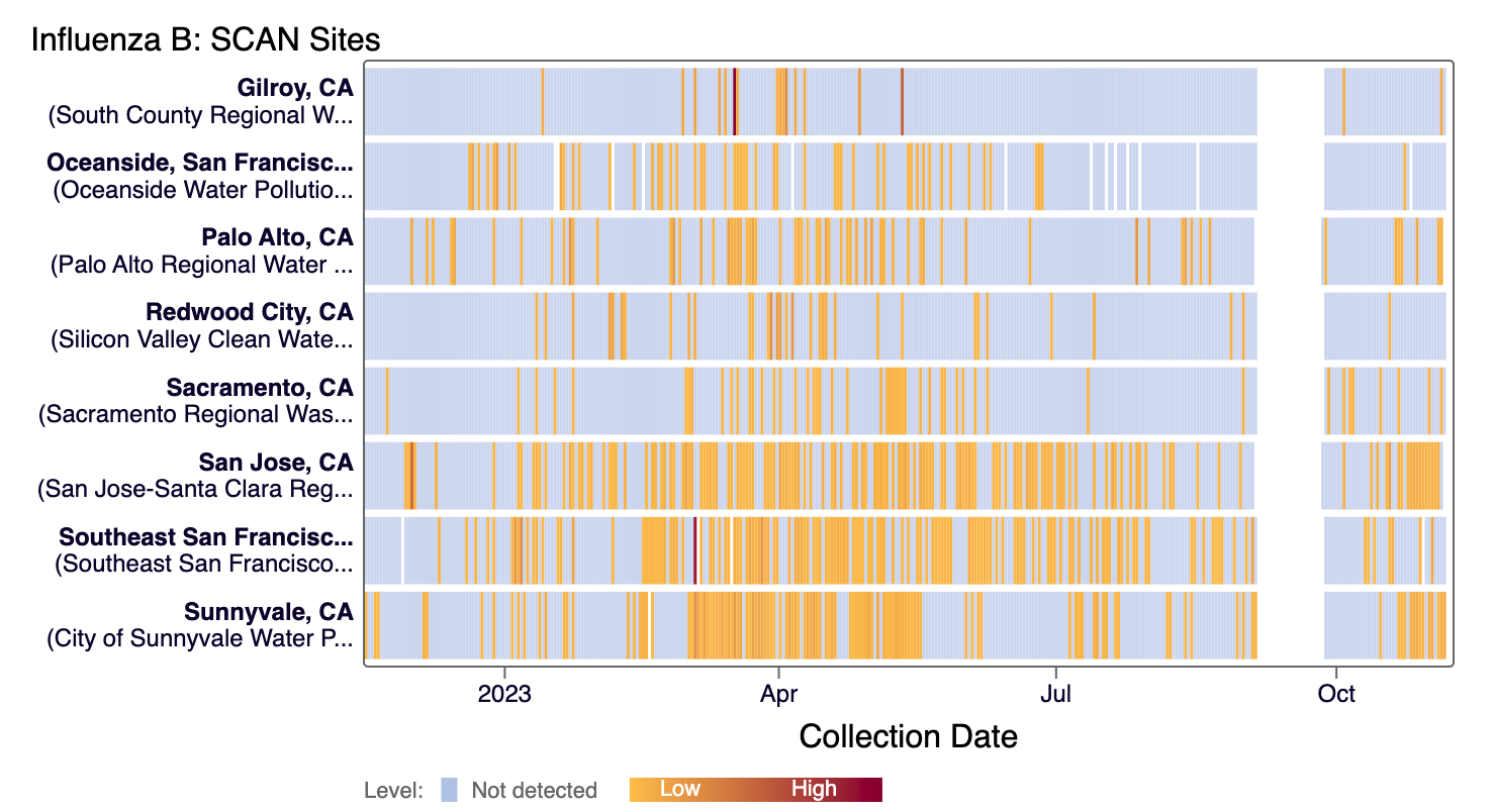 Influenza B (IBV) RNA has been sporadically detected at most SCAN sites in the last 21 days. However, IBV has been detected in the majority of San Jose and Sunnyvale samples in the last 21 days. The heat map below shows all the SCAN sites as a row and each date as a column. The color blue means the sample was non-detect for IBV RNA and the colors get darker with higher concentrations. White indicates no sample was collected. We briefly stopped monitoring for IBV, which explains gap in data across sites in September. Here is the link to the heat map chart - the linked chart will update automatically as more data are added to the site.