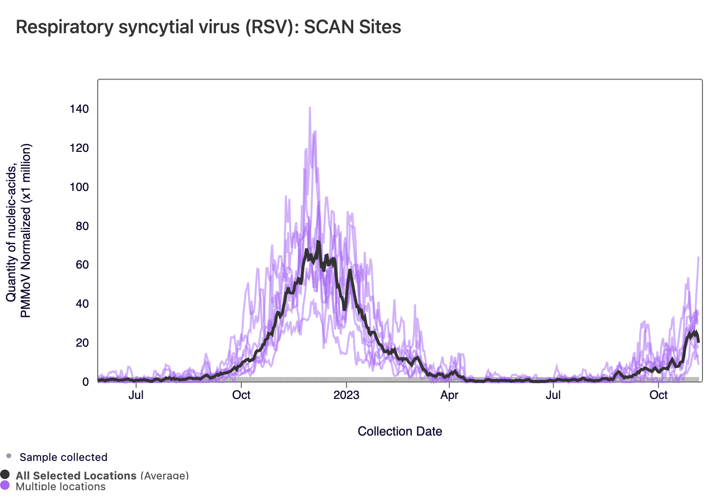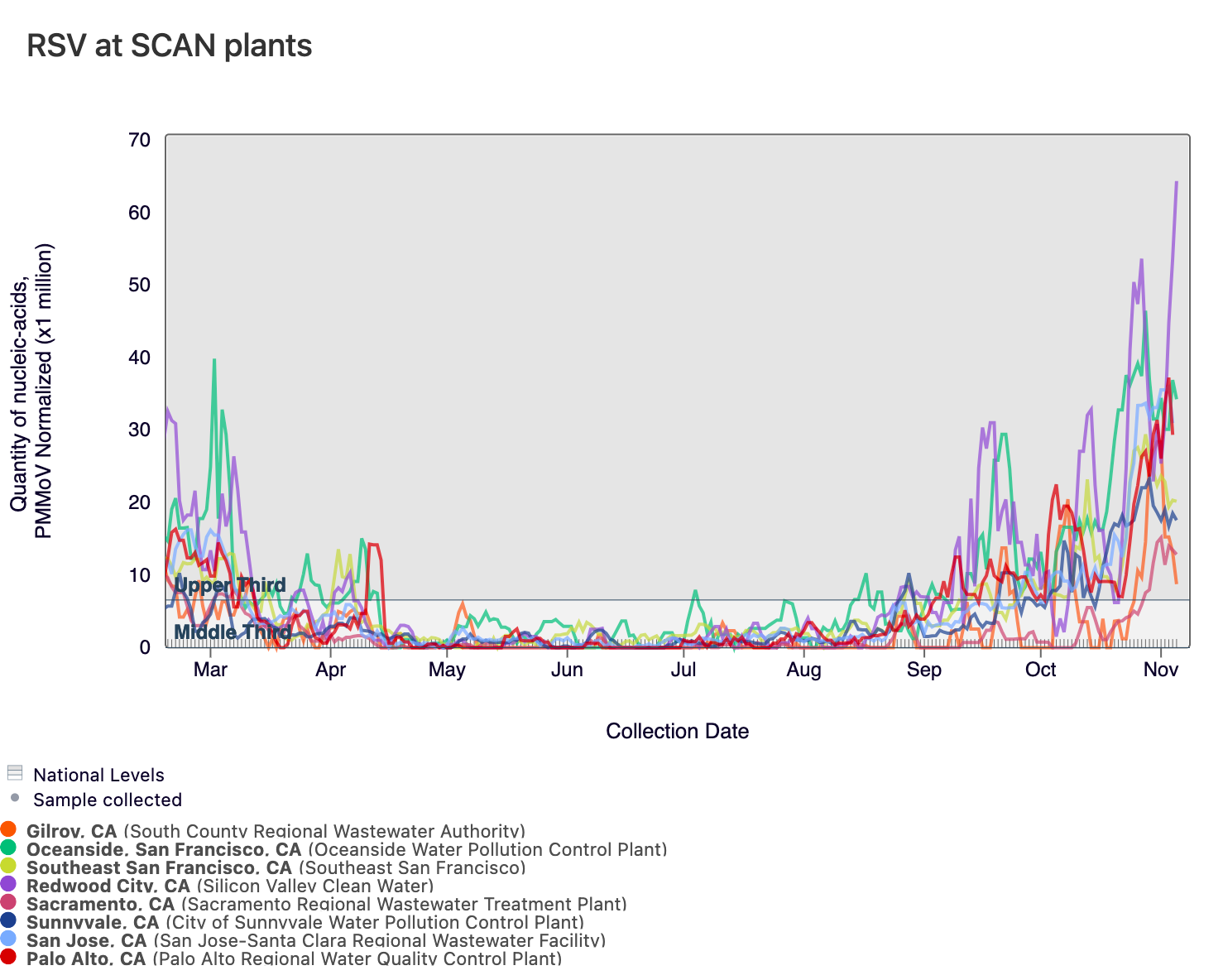 Below is a chart showing the National Levels benchmarks superimposed on the RSV data from the SCAN sites (you can access this chart here). Currently, all SCAN sites have RSV concentrations in the upper third level.