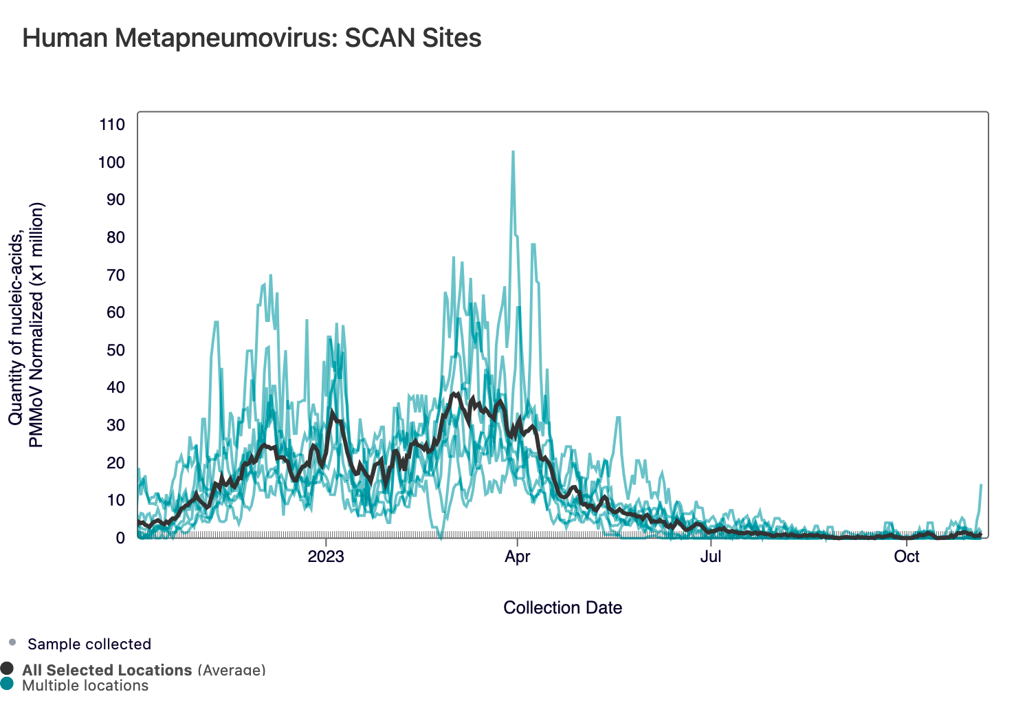 HMPV (Human metapneumovirus) RNA concentrations are low at most of plants in SCAN, except SVCW which has recently increased in concentration. In the chart below, the population weighted average line for all SCAN plants (black) is shown compared to the HMPV RNA concentrations at SVCW (purple) since April.