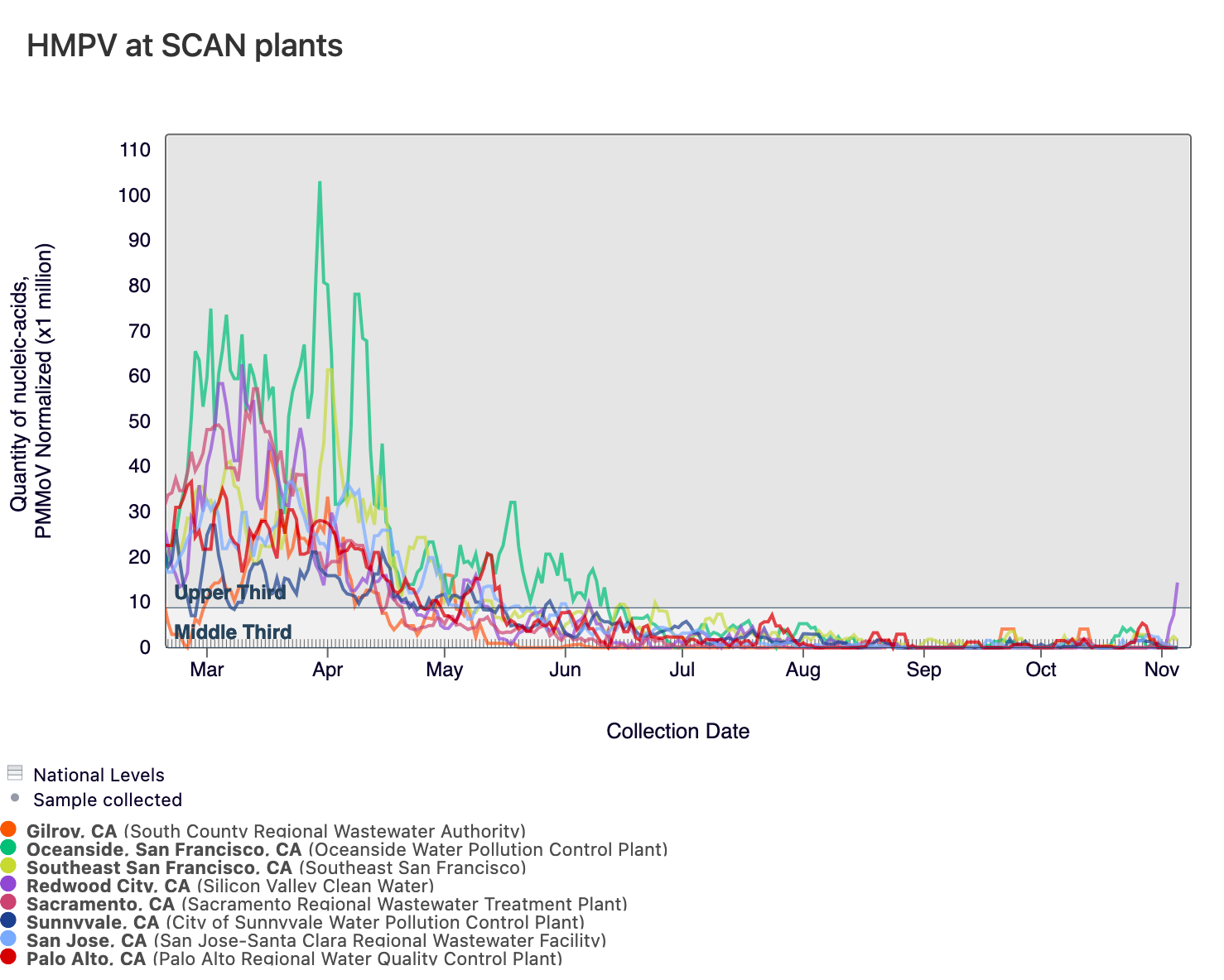 Below is a chart showing the National Levels benchmarks superimposed on the HMPV data from the SCAN sites. (You can access the chart here.) Currently, most SCAN sites have HMPV concentrations in the middle third level. SVCW has HMPV concentrations in the upper third level.