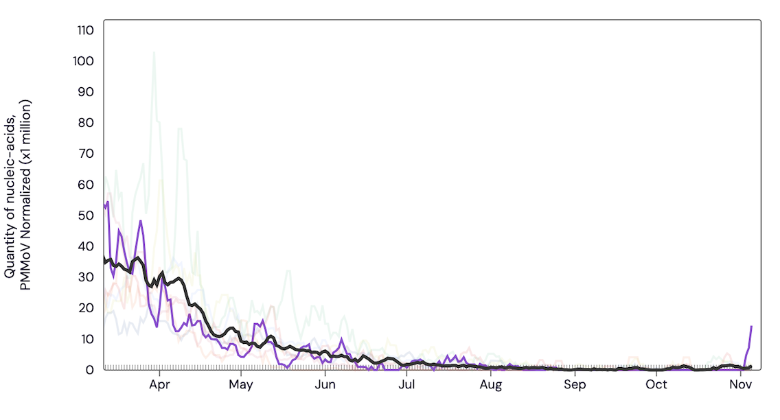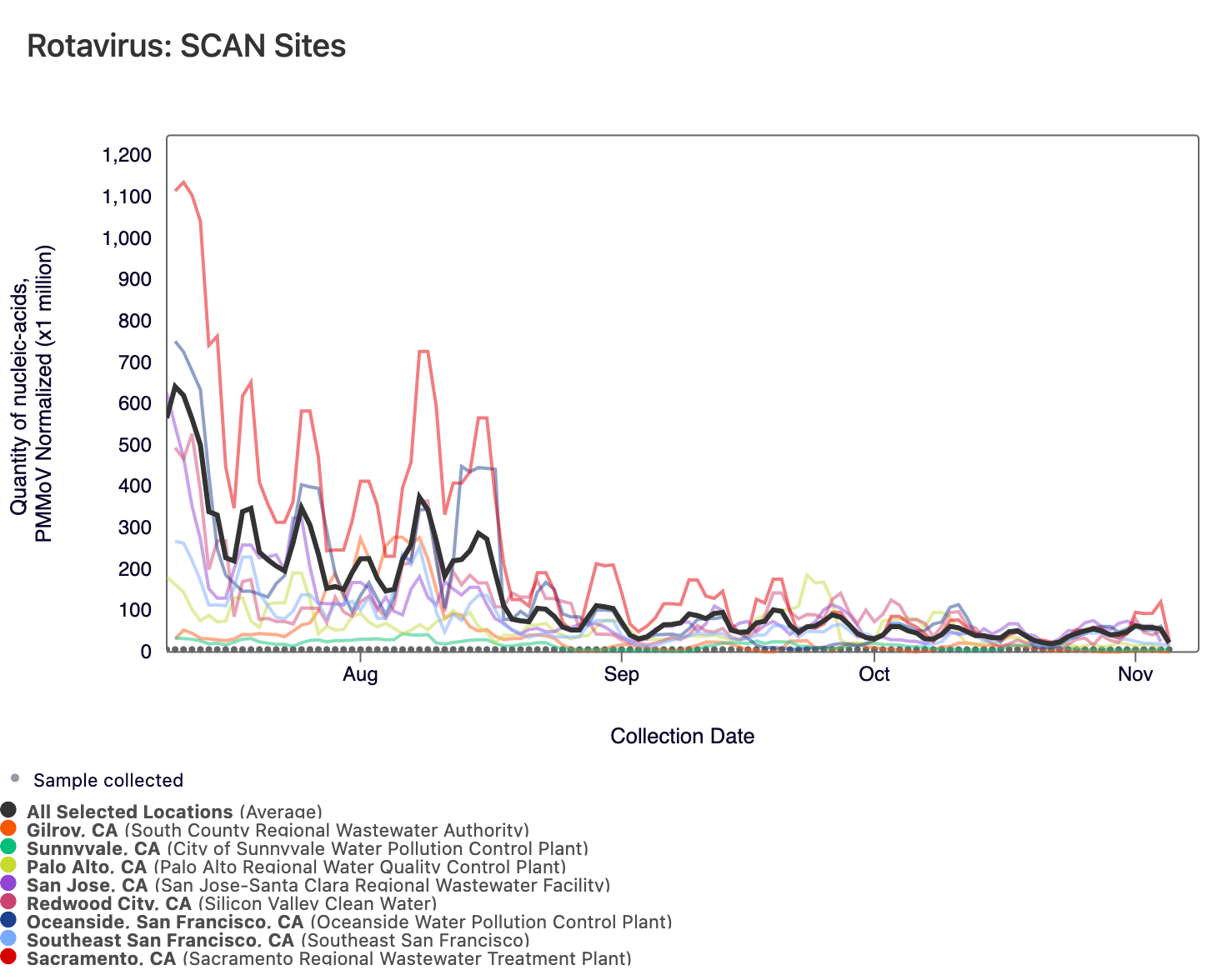 Rotavirus RNA concentrations are shown in the chart below; all the SCAN plants are shown together. The population weighted average line is shown in black. You can interact with the chart of all the plants here.