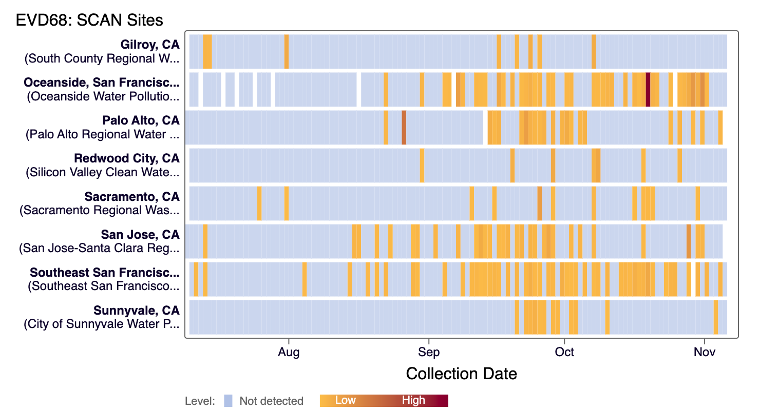 EV-D68 RNA was sporadically detected in samples collected in the last 21 days at most SCAN sites. However, at Oceanside SF and Southeast SF, EV-D68 was detected in most samples collected in the last 21 days. The heat map below shows all the SCAN sites as a row, and each date as a column since monitoring began in July. The color blue means the sample was non-detect for EV-D68 RNA and the colors get darker with higher concentrations. White indicates no sample was collected. You can access the chart here. EV-D68 is believed to occur biennially, and we saw it last year, so perhaps it will not be common this year.