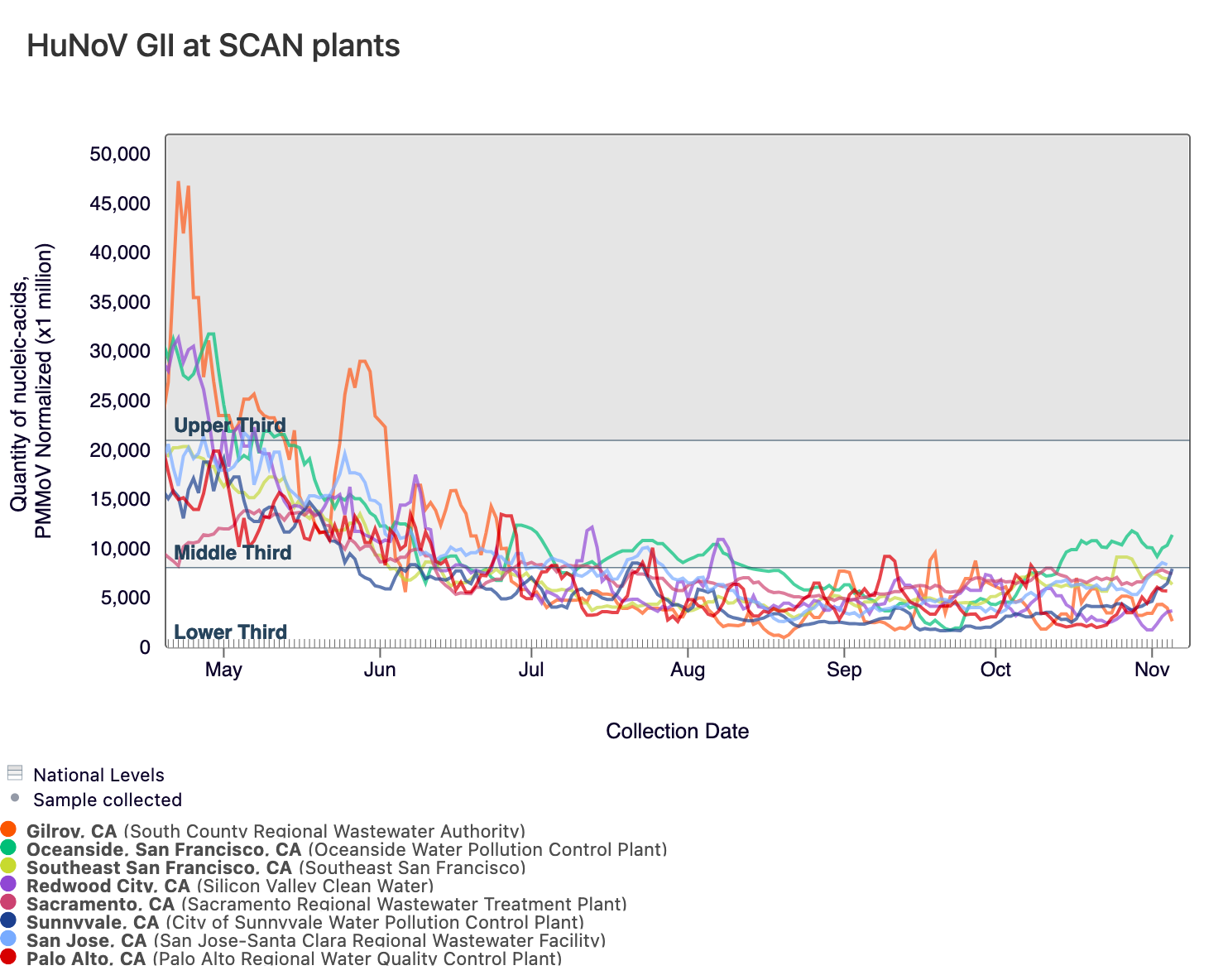 Below is a chart showing the National Levels benchmarks superimposed on the Norovirus concentrations from the SCAN sites.(You can access the chart here.) Currently most SCAN sites HuNoV GII concentrations in the lower third level except for Oceanside SF and San Jose which are in the middle third.