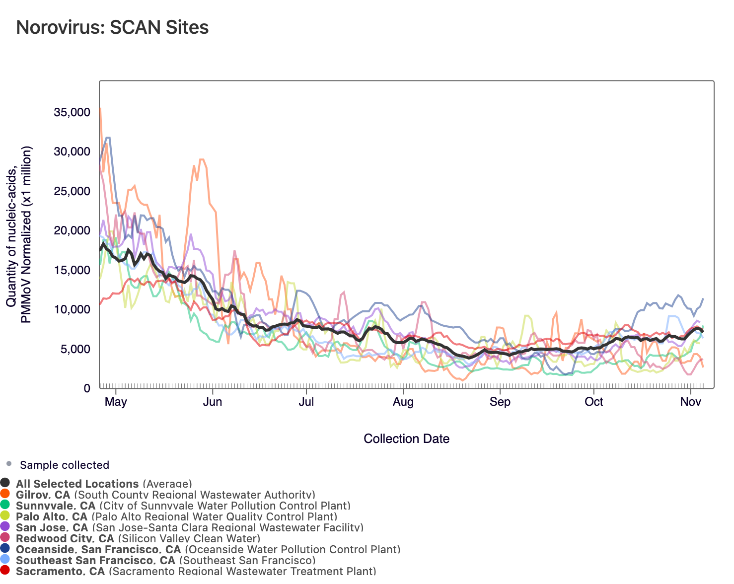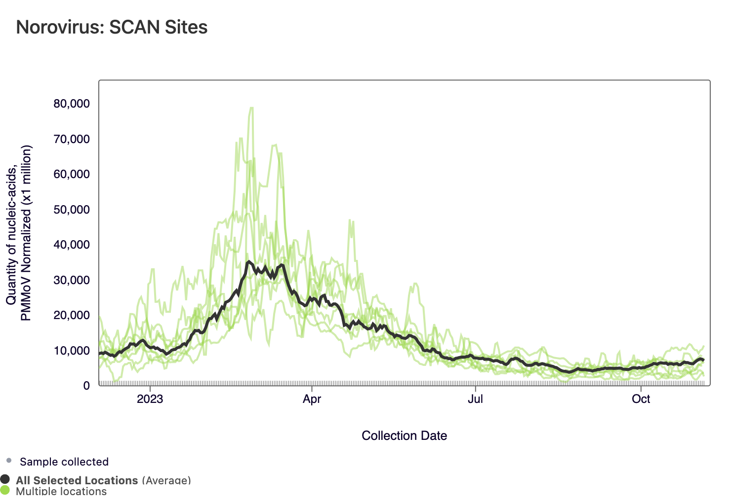The plot below shows the Norovirus concentrations at the SCAN sites. The population weighted average line is shown in black. You can interact with the chart of all the plants at this link.