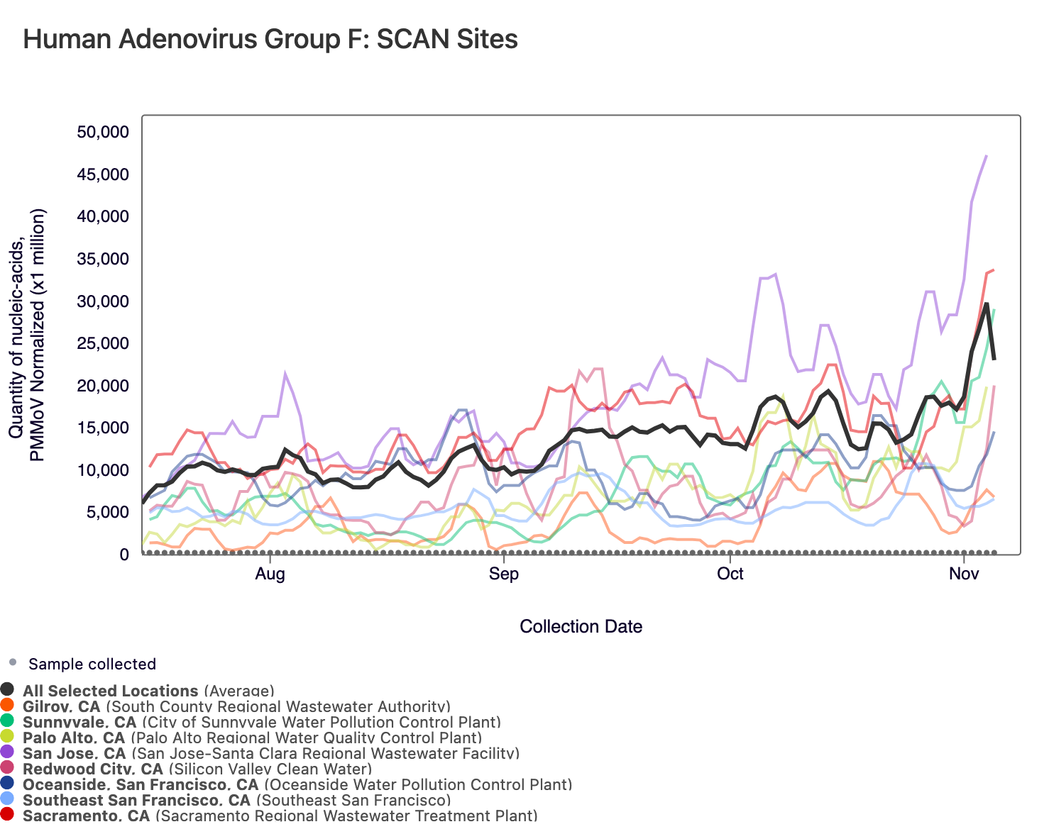 Human Adenovirus Group F DNA concentrations are shown in the chart below; all the SCAN plants are shown together. The population weighted average line is shown in black. You can interact with the chart of all the plants here.