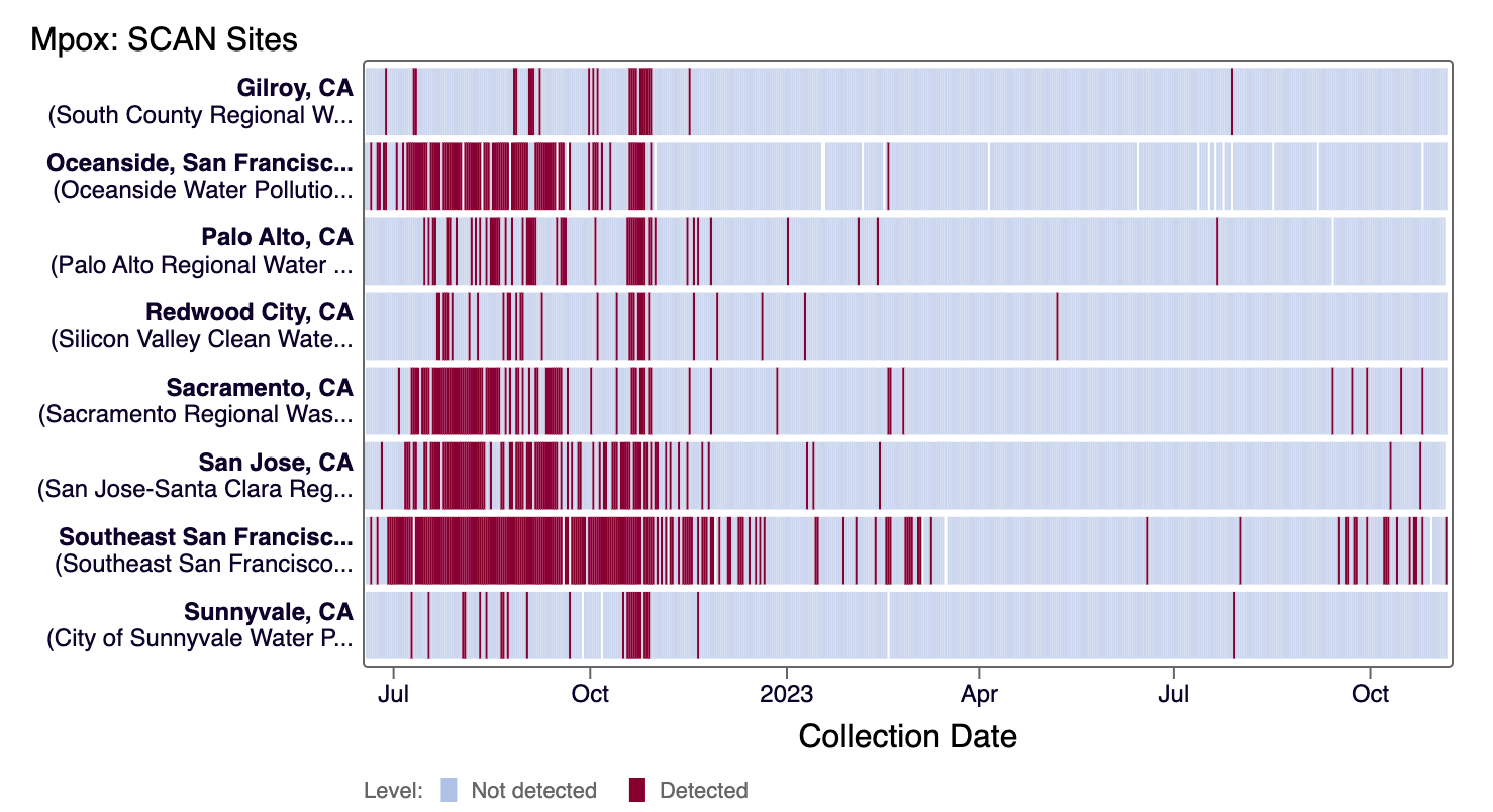 Mpox DNA was not detected in most samples collected in the last 21 days at most SCAN sites. However, at Southeast SF Mpox DNA was detected sporadically in the last 21 days. The heat map below shows all the SCAN sites as a row, and each date as a column since July 2022. The color blue means that MPXV DNA was not detected in the sample, and the dark purple color means it was detected. White indicates no sample was collected. The chart shows all the data we have collected. You can access the chart here.