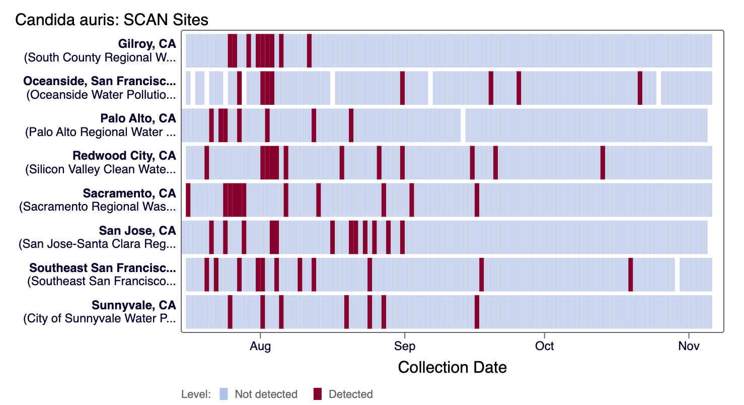 Candida auris DNA was not detected in most samples collected in the last 21 days at SCAN sites. The heat map below shows all the SCAN sites as a row, and each date as a column for all data collected since monitoring began in July. The color blue means that Candida auris DNA was not detected in the sample, and the dark purple color means it was detected. White indicates no sample was collected. You can access the chart here.
