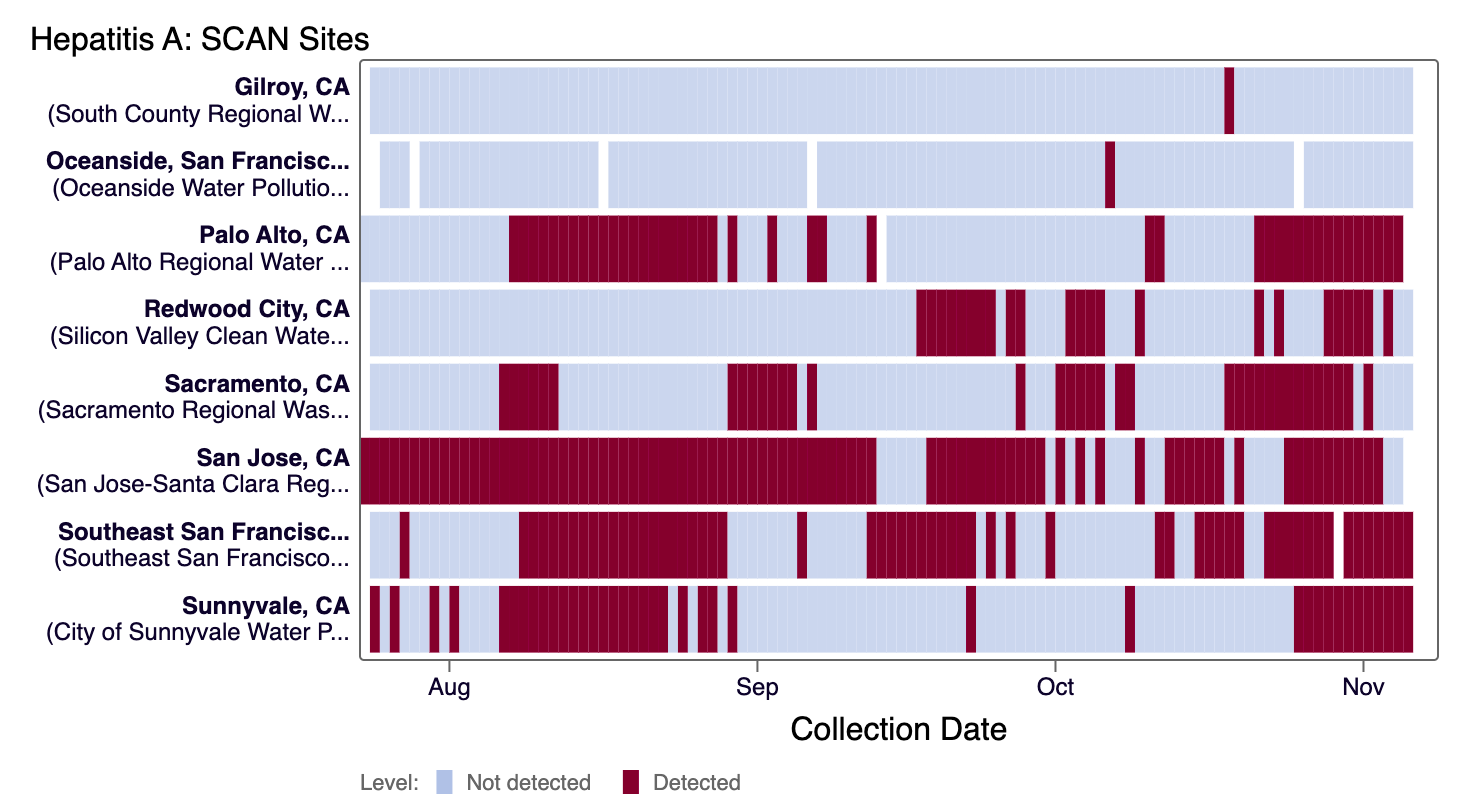 Hepatitis A RNA was detected in most samples from most SCAN plants and detected infrequently at Oceanside SF and Gilroy in the last 21 days. The heat map below shows all the SCAN sites as a row, and each date as a column for all data collected since monitoring began in July. The color blue means that Hepatitis A RNA was not detected in the sample, and the dark purple color means it was detected. White indicates no sample was collected. You can access the chart here.