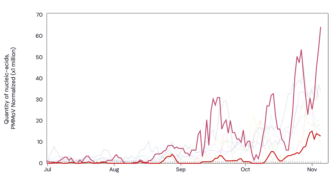 RSV RNA concentrations have increased for most SCAN sites since the beginning of September. In the chart below, the RSV RNA concentrations at Sacramento (red, bottom) are shown compared to those at SVCW (pink, top) since July. Seven sites have met the benchmark for onset including SVCW and Sacramento, which had not met the benchmark at this time last week.