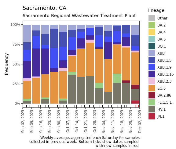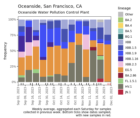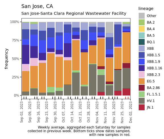 Below are plots from Oceanside SF, Sacramento, and San Jose showing the relative proportions of different variants inferred from sequencing the entire genome of SARS-CoV-2. In the most recent samples, EG.5 made up at least 30% of the lineages detected at Oceanside SF, Sacramento, and San Jose. In addition, BA.2.86, HV.1, and JN.1 were detected at Sacramento and San Jose. Note that the sequencing data are always from samples taken between 1- 2 weeks ago.