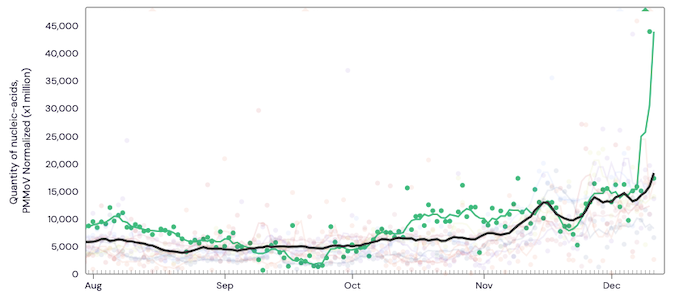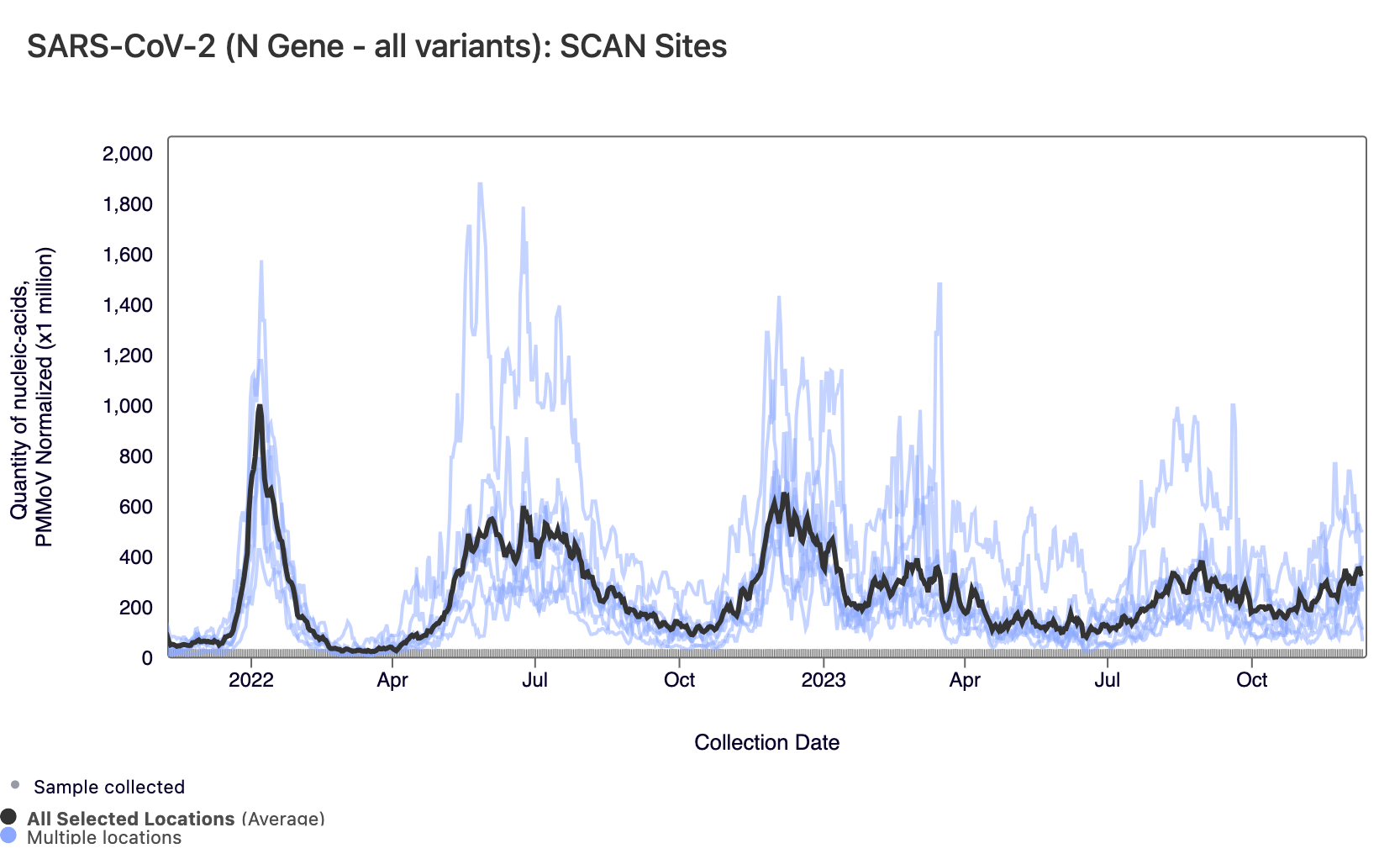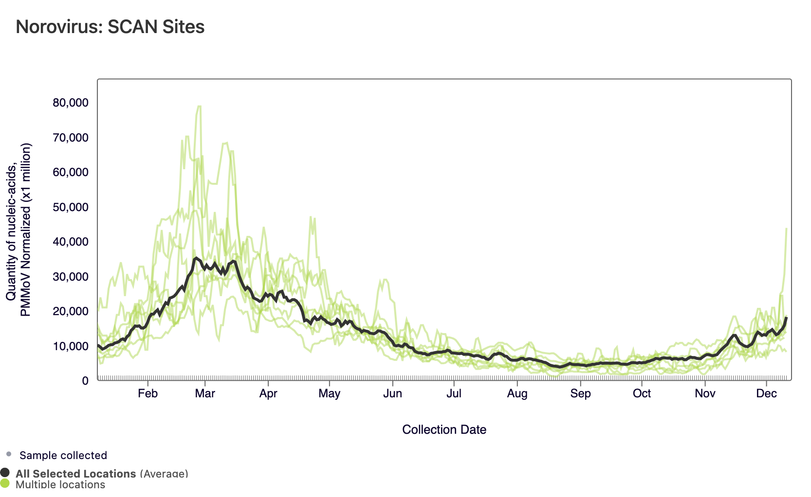 The plot below shows the Norovirus concentrations at the SCAN sites. The population weighted average line is shown in black. You can interact with the chart of all the plants at this link.