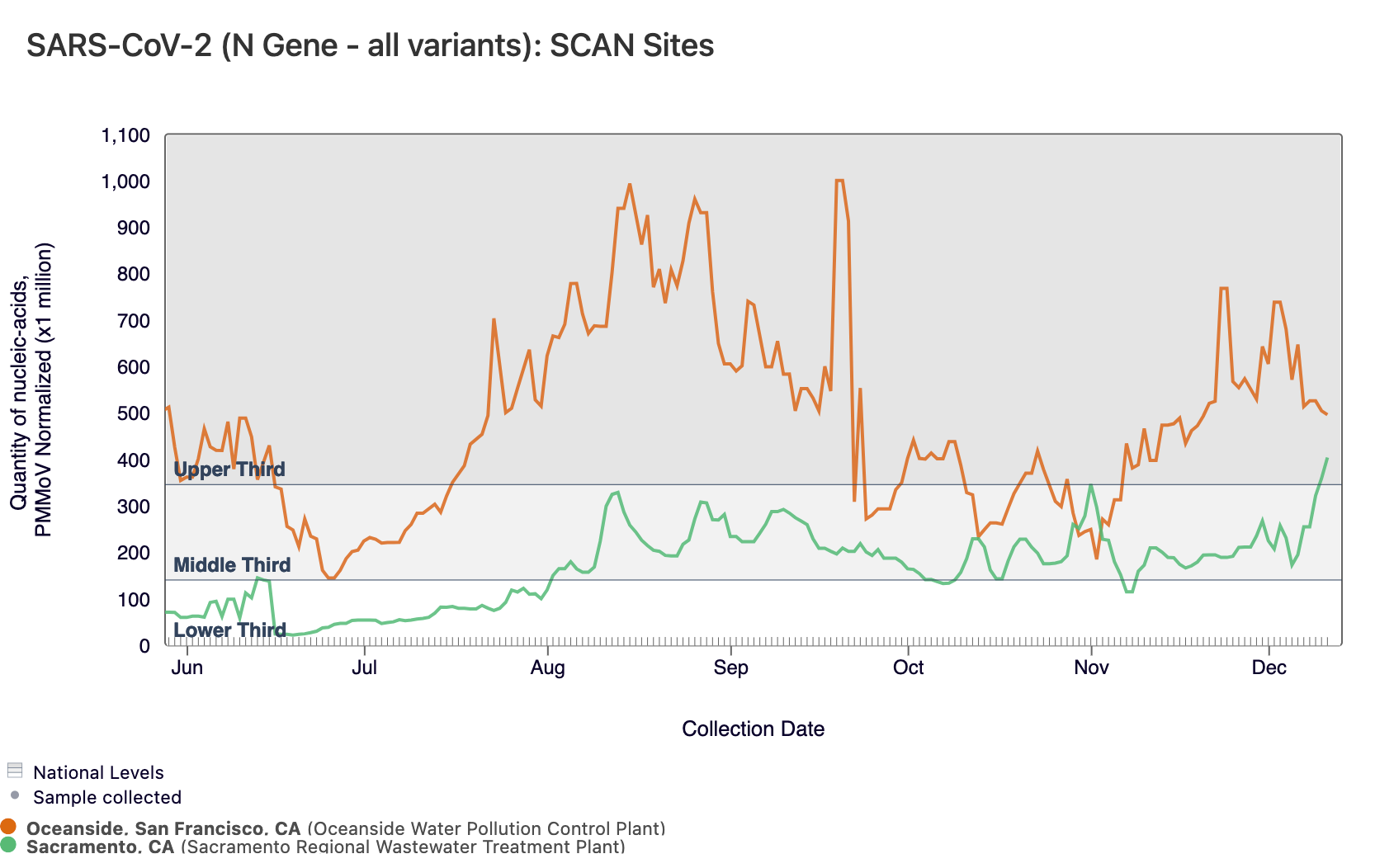 SARS-CoV-2 N gene concentrations are between 10,000 and ~100,000 copies/g. In the chart below, the National Levels benchmarks are superimposed on the the SARS-CoV-2 concentrations at Sacramento and Oceanside SF since June.